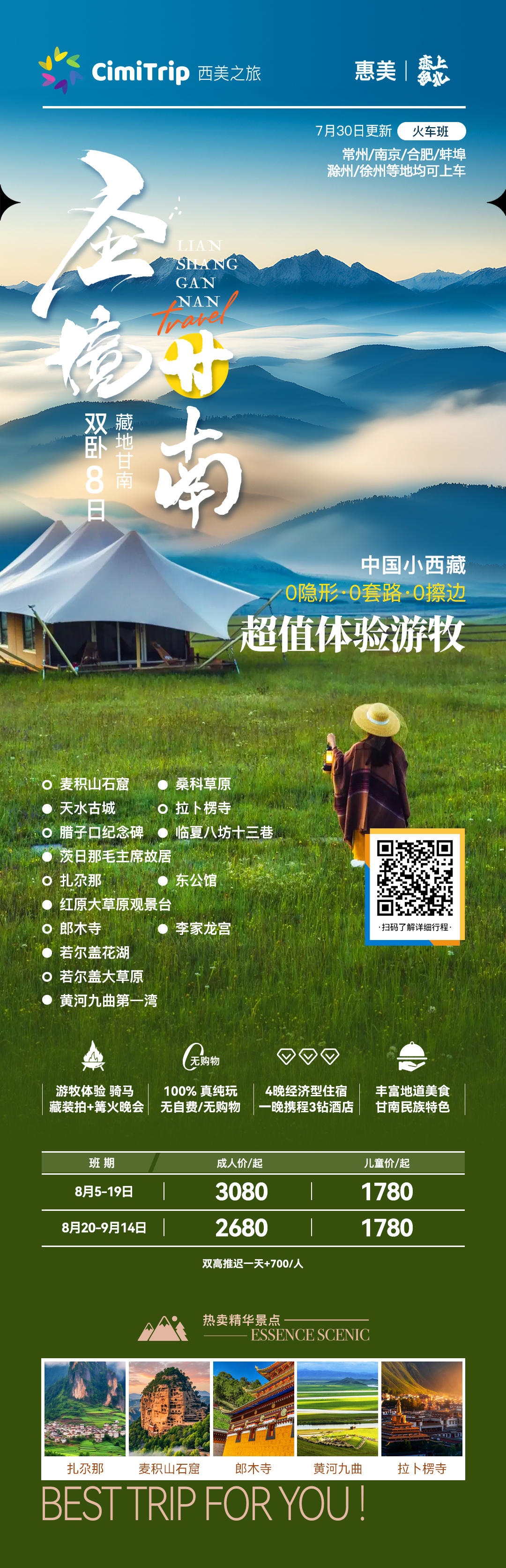 6、不包含景区小交通:麦积山电瓶车30元/人及登窟门票80元/人、九曲黄河第一湾扶梯60元/人、花湖电瓶车30元/人、扎尕那电瓶车40元/人及意外险5元/人。