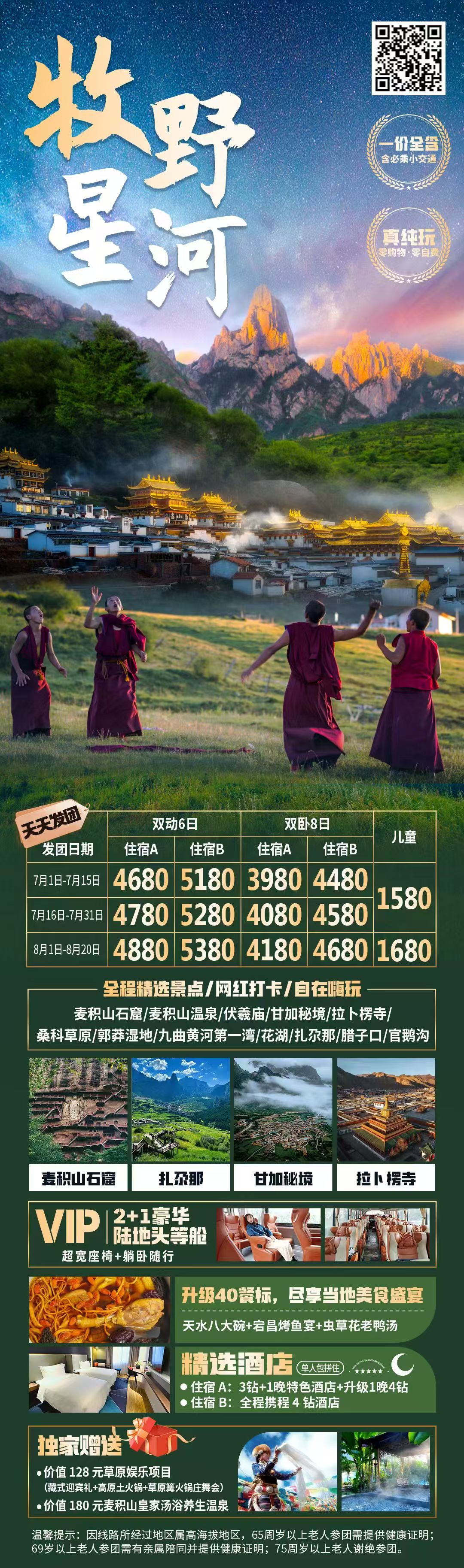 甘肃天水6晚7日跟团游【牧野星河】麦积山石窟·伏羲庙·甘加秘境·拉卜楞寺·黄河九曲第一湾·扎尕那·花湖· 腊子口纪念碑·麦积山温泉·官鹅沟全景甘南动车6+1日游