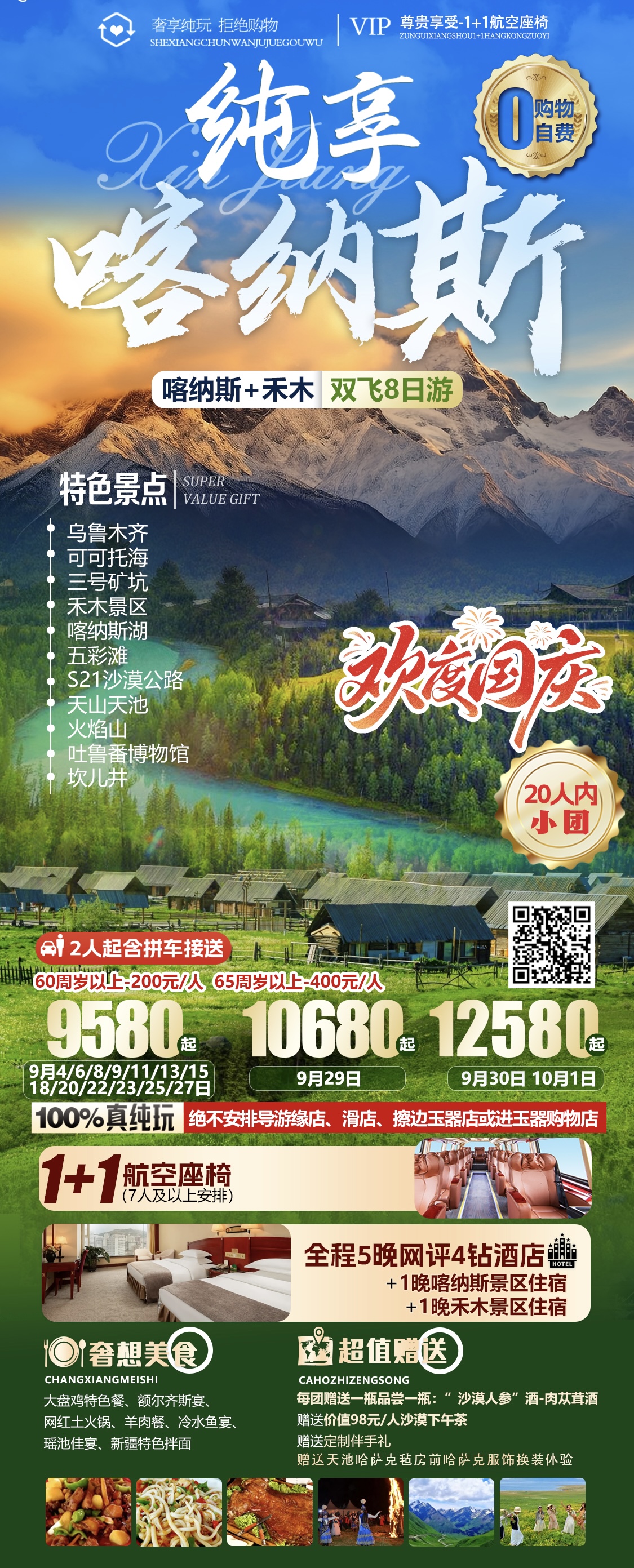 1、喀纳斯景区条件有限,加餐、买东西等各种消费价格较贵,敬请提前做好心理准备;