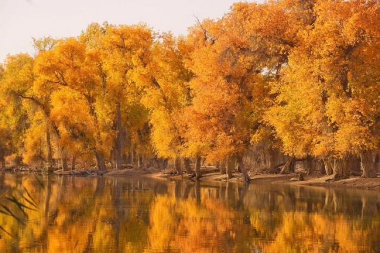 叶尔羌河水相伴,芦苇荡与戈壁地貌交错,"一林双貌,"水波映金叶"—巴楚红海胡杨