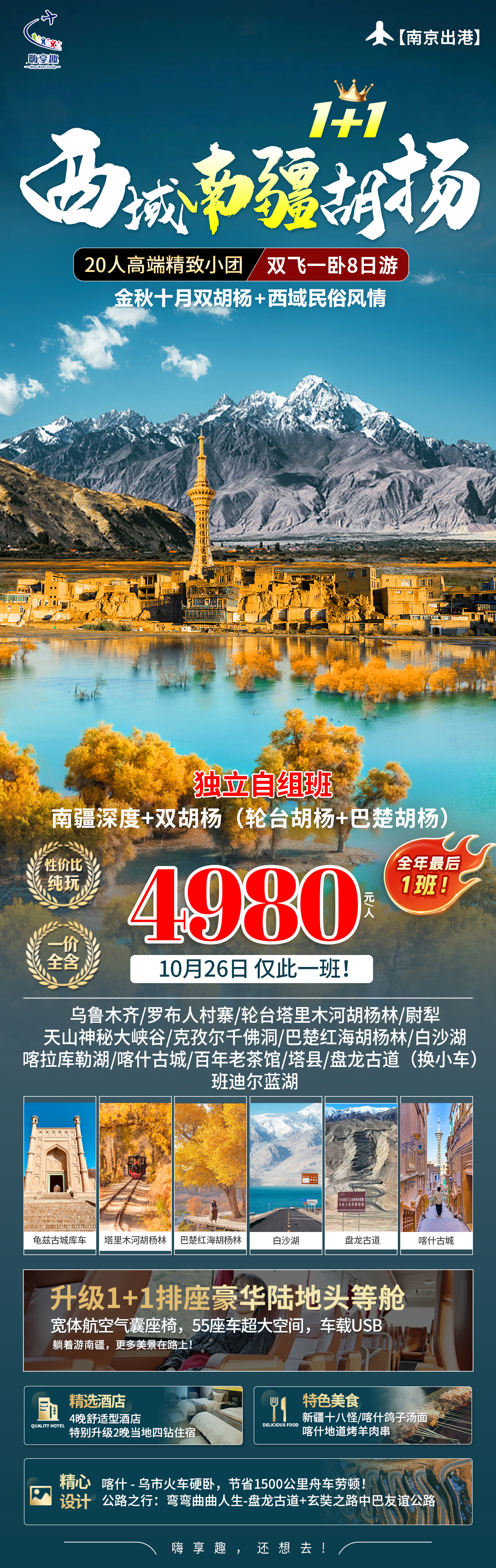 新疆乌鲁木齐喀什双飞一卧8日游【20人南疆定制|西域南疆胡杨】双飞一卧8日游(10.26班期)
