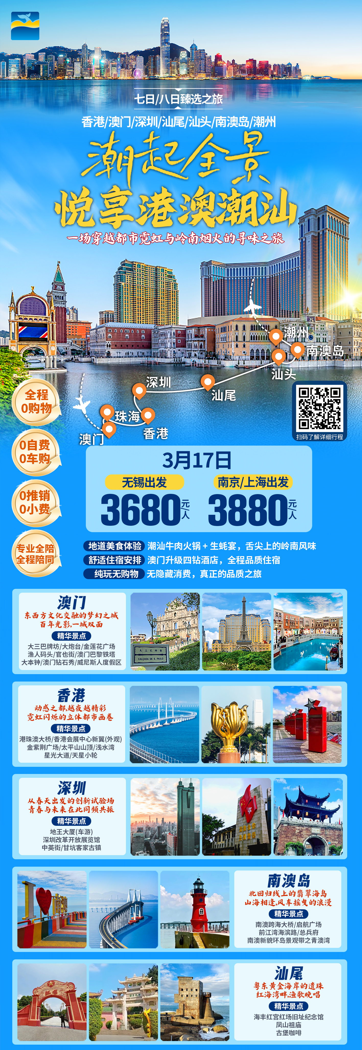 第六天 | 汕头 - 南澳岛 早餐后车游汕头新八景之一【海滨长廊】、【人民广场】。 游览建于清代耗资八万银元,至今已有一百多年的历、粤东地区的主要海防建筑【石炮台公园】。 观汕头开埠前最古老的建筑【老妈宫】过去曾是潮人离开家乡漂洋过海谋生的出发地,出发前必在这里祭拜妈祖祈求海路平安的地方。 结束后前往游览被《国家地理杂志》评选为“广东最美的岛屿”—【南澳岛】,车游海上巨龙—【南澳跨海大桥】,领略海上奇观,南澳大桥是第一座跨海大桥。 后游览【启航广场】,位于南澳大桥收费站的对面,占地约16亩。观景台、景观石、绿化、步道等配套,在广场可观赏到南澳大桥的宏伟景观。后车游新南澳外滩—【前江湾海滨路】,途观明嘉靖年间海盗巨魁吴平藏金、“水涨淹不到,水退淹三尺”之地的【金银岛】、富有海岛特色的【海上渔村】、亚洲最大的海岛风能发电场——【风车山】。后参观【总兵府】总兵府署居深澳城正中。 游览【南澳新貌环岛景观带之青澳湾】,漫步于中国最美海岸线—【青澳湾天然沙滩泳场】素有“东方夏威夷”之称的青澳湾,海湾似新月,海面如平湖。金黄柔软的沙湾绵延2400多米,坡度平缓,沙质洁净,一直延伸至水下百米以外,无礁石无淤泥;海水无陵质无污染,潮涨潮落不改澄碧颜色;背倚险峻高山,山上奇石嶙峋;环抱海湾的是纵深百米的防风林带,四季郁郁葱,同晶莹金黄的沙湾、湛蓝透亮的海水,形成了分明的立体层次,是广省两个A级沐浴海滩之一、。 结束后,入住酒店休息。 (注:本日行程游览顺序会根据酒店位置及实际交通状况优化调整) | 早 中 晚 | 南澳岛海景公寓/3钻商务酒店 |