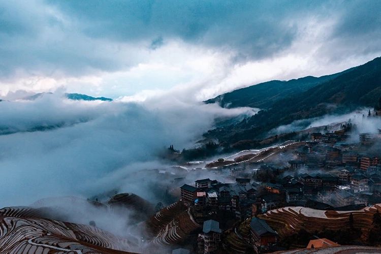面积庞大的龙脊梯田始建于元朝,完工于清初,从溪水湍急的河谷,到白云缭绕的山巅,顺着山坡划出一道道优美的曲线,普通的水稻梯田将整座的山峦变成了大地的音符,呈现出规模宏大的艺术画卷,这是壮族、瑶族人民勤劳智慧的结晶,清晨日出观景。