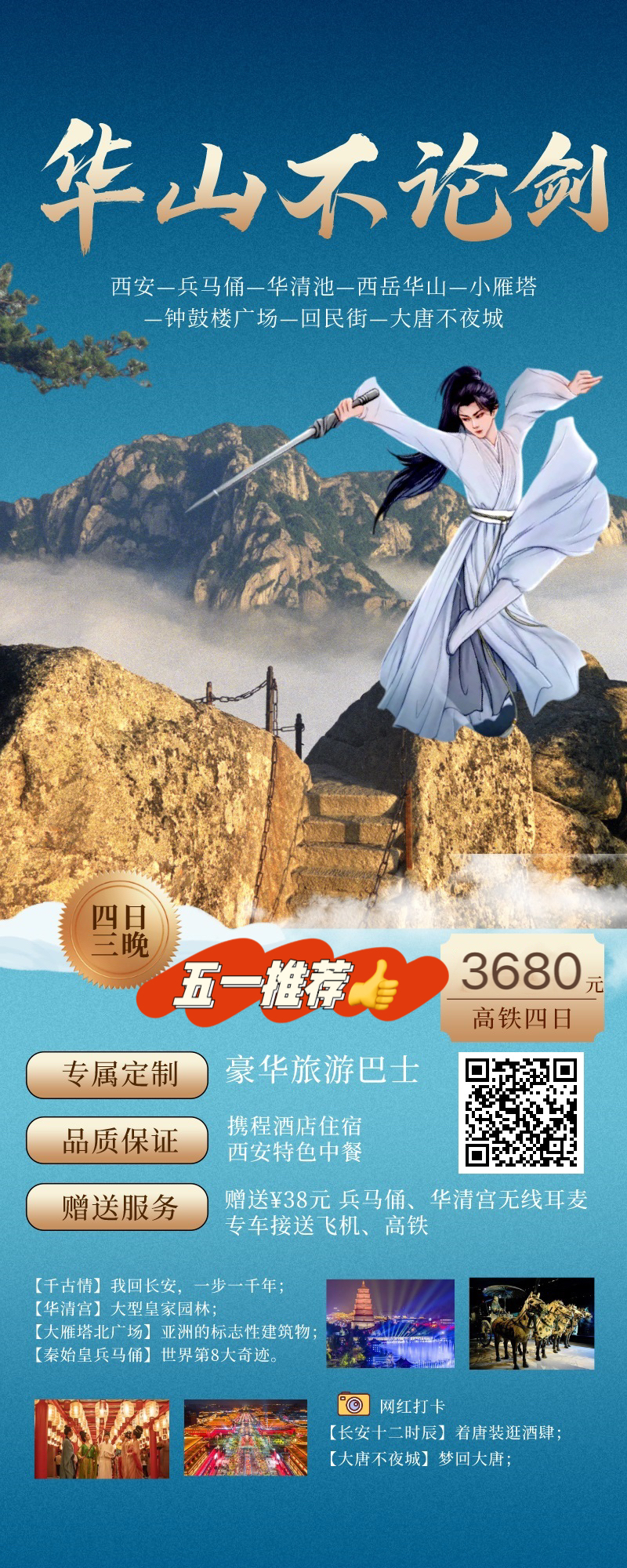 殊产品,不用费用不退),包含登山手套,祈福带】。自行游览“奇险天下第一山”【华山】(游览约5小时),“山高五