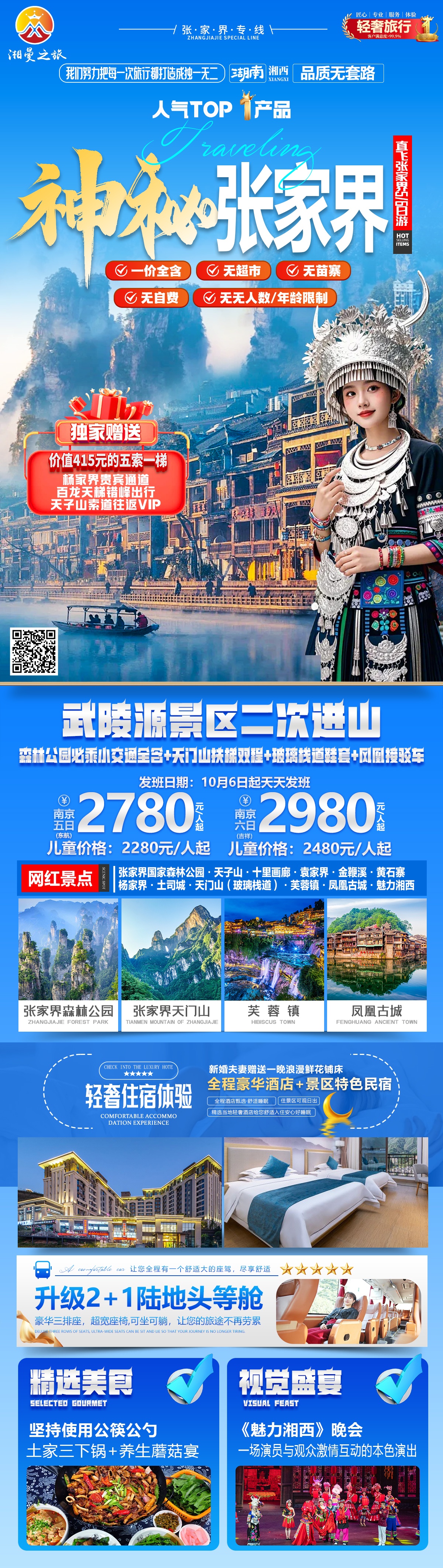 早餐后前往我国的第一个国家森林公园,世界自然遗产,世界地质公园,首批国家AAAAA景区——【武陵源风景名胜区AAAAA】,游览【杨家界核心景区】(赠送杨家界索道单程贵宾通道,减少排队时间),观全球绝版【峰墙长城】,看峰林之绝;环保车抵达【袁家界核心景区】(赠送百龙天梯下行,错峰乘坐,减少排队时间)《阿凡达》外景拍摄地——哈利路亚山,抵达潘多拉星球--电影《阿凡达》外景拍摄地——【哈利路亚山】探寻影视阿凡达中群山漂浮、星罗棋布的玄幻莫测世界;【天下第一桥】云雾缭绕、峰峦叠嶂、气势磅礴,大小景点应接不暇,忘却归路。【十里画廊景区】(景区配有代步观景小火车往返76元可供自愿选择)在这条长达十余里的山谷两侧,有着丰富的自然景观,人行其间如在画中。沟旁黛峰屏列,山上的岩石形成了200来尊似人似物、似鸟似兽的石景造型,其中"孔雀开屏"、"采药老人"、"寿星迎宾"、"猛虎啸天"“夫妻抱子”、“三姐妹峰”等最为著名。游览【天子山自然保护区】(赠送天子山索道VIP往返),天子山位于张家界国家森林公园的北部,东临索溪峪景区,因其原始的自然风光而闻名,有各种造型奇异的地质景观和奇形山峰,如【御笔峰】、【仙女献花】等。雨过初晴的天子山云雾十分壮观,奔涌的云雾形态多样,波澜壮阔。【西海石林】,为一盆地型峡谷峰林群。“海”内峰柱林立,千姿百态,林木葱茏茂密,有“峰海”、“林海”之称,【贺龙公园】为纪念元帅而建,坐落有元帅的铜像、元帅陈列馆等,供后人瞻仰这位伟大的元帅,了解元帅的生平事迹。缅怀革命先烈,喝水不忘挖井人。晚间观看冯小刚导演、刘欢任音乐总监的【魅力湘西】大型民俗风情晚会(普座票赠送已含,不去不退,亦不做等价交换),魅力湘西大剧院是国家文化产业示范基地、中国文化品牌30强、中国旅游演艺票房十强,连续三年荣登央视春晚,多次代表中国艺术全世界巡回演出,受到至尊礼遇,引起国际轰动,让世界重新认识艺术中国、文化中国、魅力中国,见证了民族的、才是世界的!