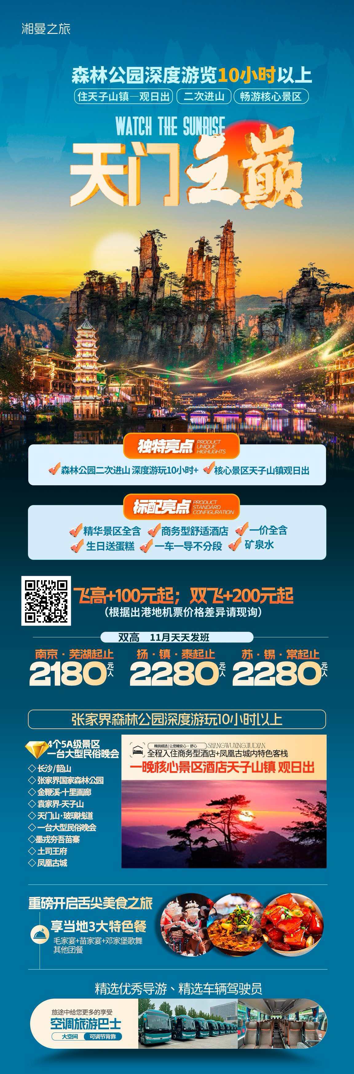 1、景点:韶山+凤凰古城+湘西苗寨+张家界国家森林公园+天门山+大型民俗晚会