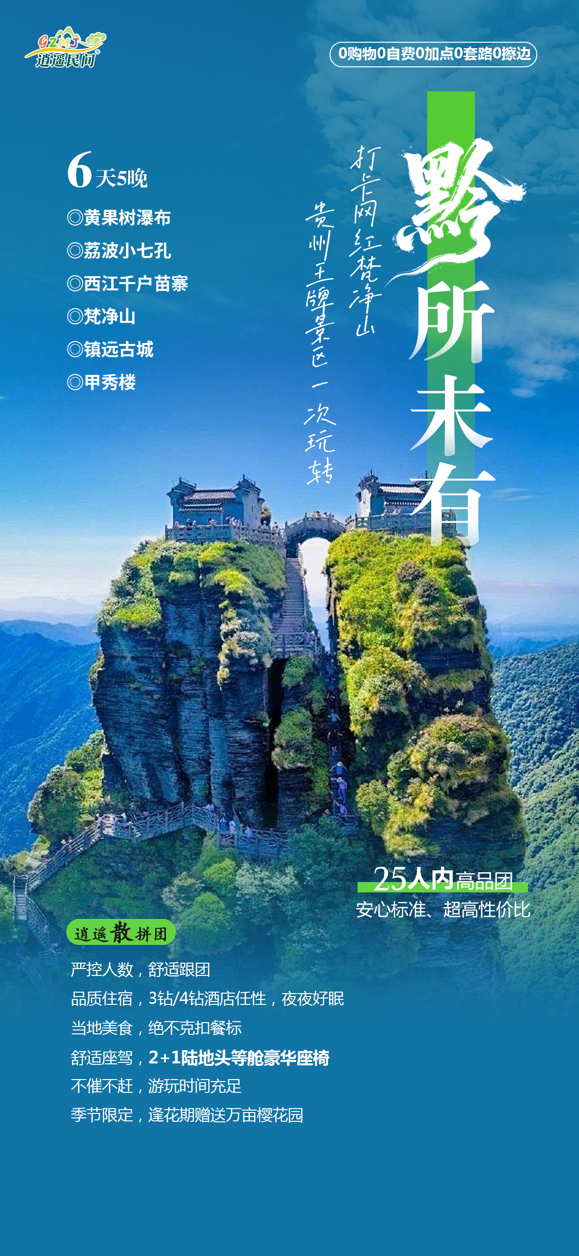 黔所未有-贵州6天5晚25人跟团散拼游纯玩 • 核心景区一次玩转 • 匠心出品 • 物超所值 • 29人内精致高品团
