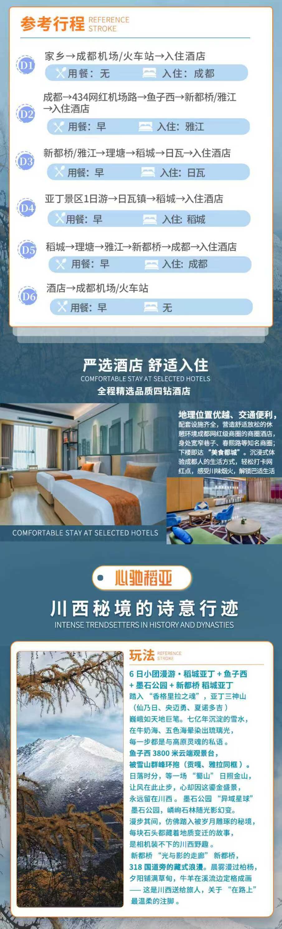 - 住宿:稻城网评4钻酒店:明宇丽雅阳光温泉,泰月,圣地映像,稻城稻亚·澜悦,翔云(或同标准其他酒店/民宿)