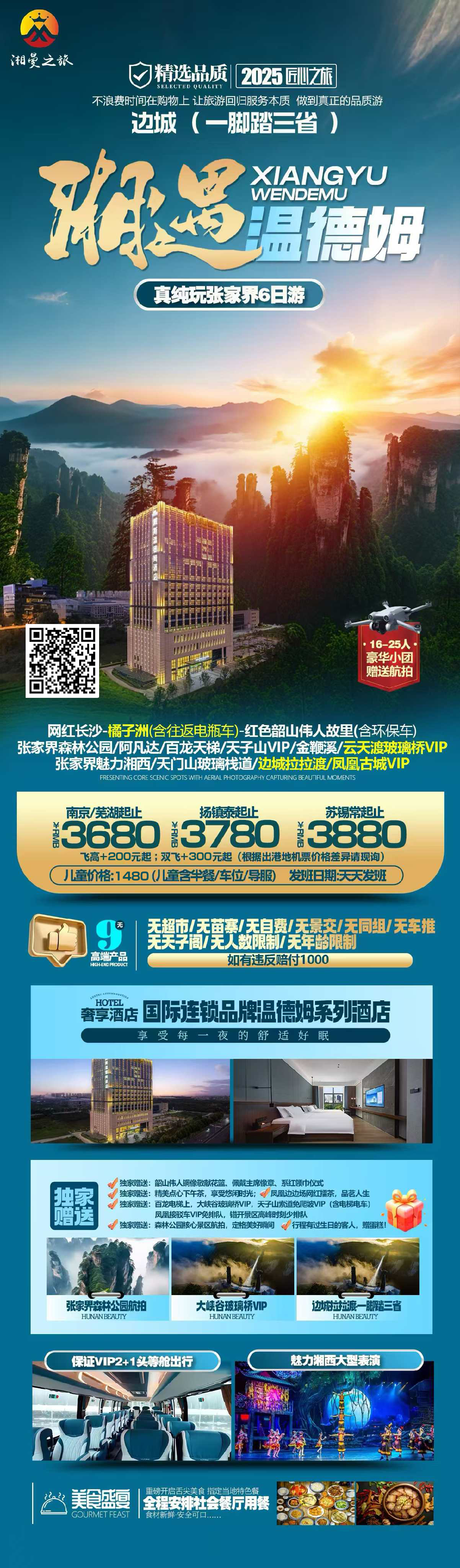 1、门票:含橘子洲、韶山电瓶车、张家界国家森林公园、百龙电梯单程、天子山索道单程VIP通道、魅力湘西,天门山玻璃栈道、云天渡玻璃桥VIP、边城(已含拉拉度)、凤凰古城(接驳车VIP通道)