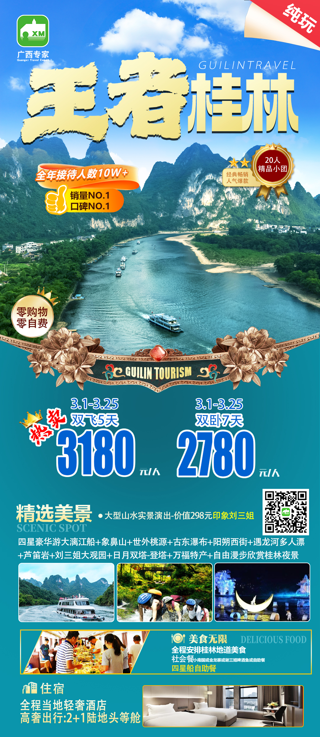 行程中列举的时间为参考时间,具体出发/抵达时间具体以当地实际情况为准,如遇到堵车,景区排队,漓江水位大小等特殊情况,游览顺序以及游览时间根据当地情况适当安排。不再另行通知,敬请谅解!!!2.如因自然原因和政策性因素等造成不能参观景点,我社按照团队优惠价格只现退门票。