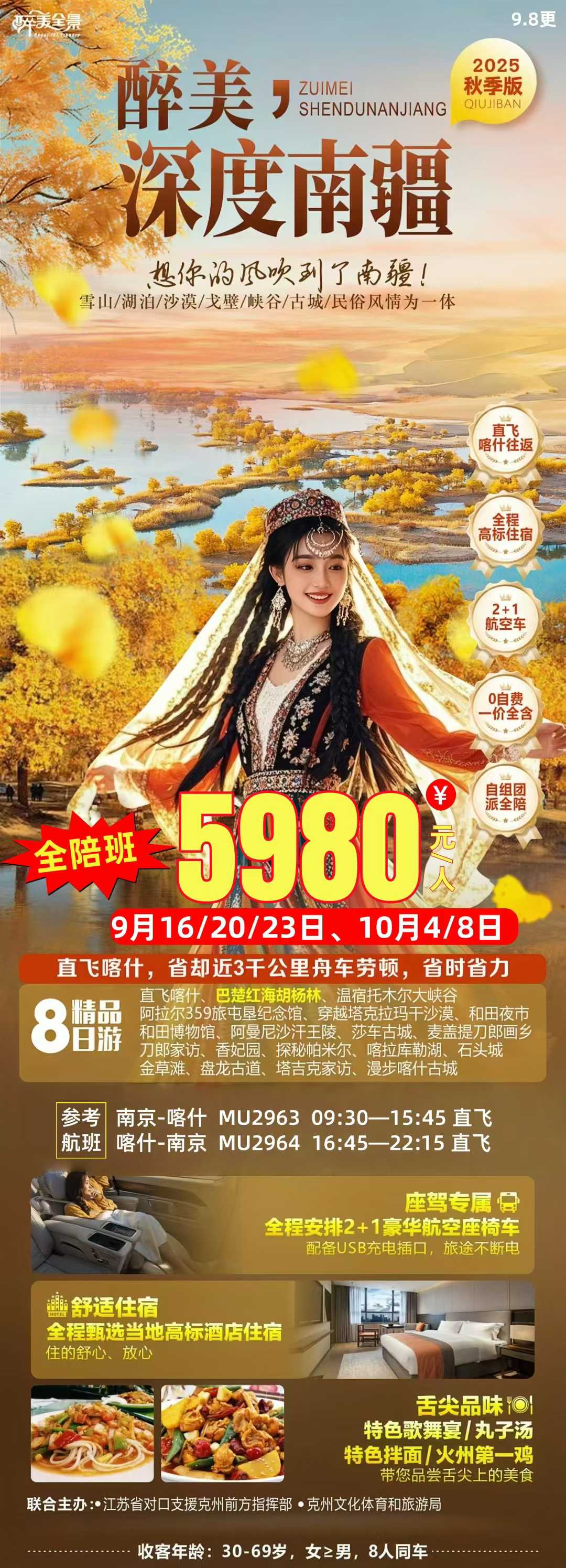 第1天南京(直飞)喀什 -巴楚(约270KM/约4H) 参考航班:MU2963 09:30—15:45 直飞