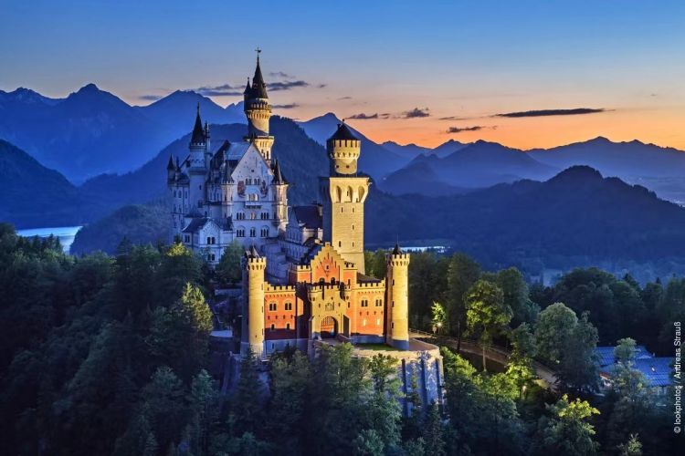这不是城堡,是巴伐利亚国王路德维希二世用执念 织就的梦-新天鹅堡。洁白塔尖刺入阿尔卑斯云 雾之中,四周湖山环抱,犹如圣洁孤岛。入内探访, 宝座厅未竟的王朝幻想、歌手厅萦绕的瓦格纳乐 章、卧室雕花里藏匿的忧郁与纯粹 … …一步一景, 皆是国王用建筑写就的情书与遗言。亲临此地,您 不仅是游客,更是被接引进入童话秘境的聆梦者。