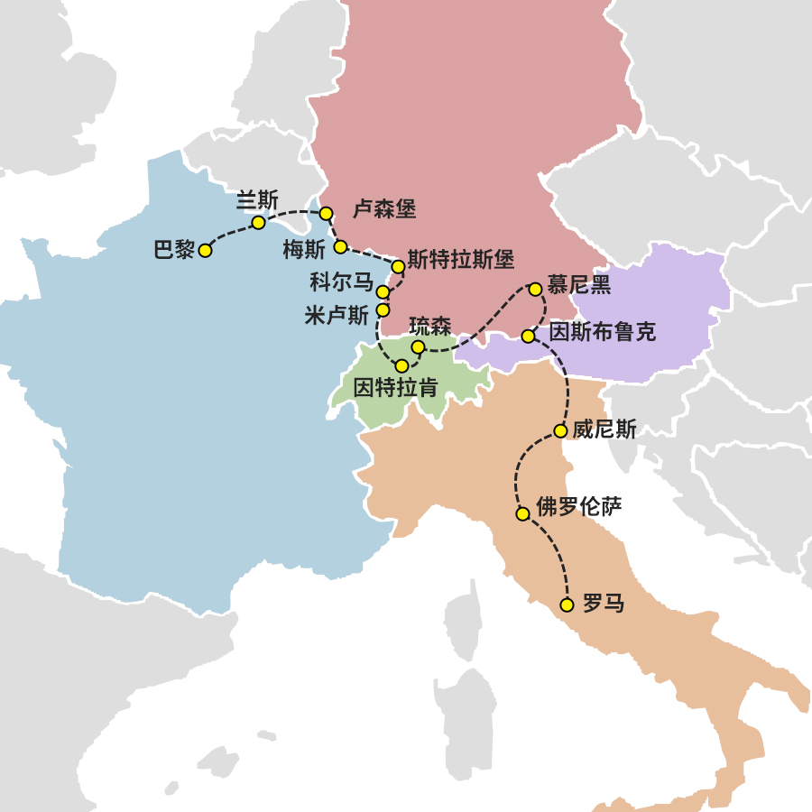 【惠享·深度】七国纵贯,童话秘境 法意瑞德卢列奥+新天鹅堡10晚12日卢浮宫·凡尔赛宫·兰斯·斯特拉斯堡·科尔马·卢森堡·雪朗峰007套餐·新天鹅堡· 黄金屋顶·邮票王国·双游船·赠送3个途经国·
