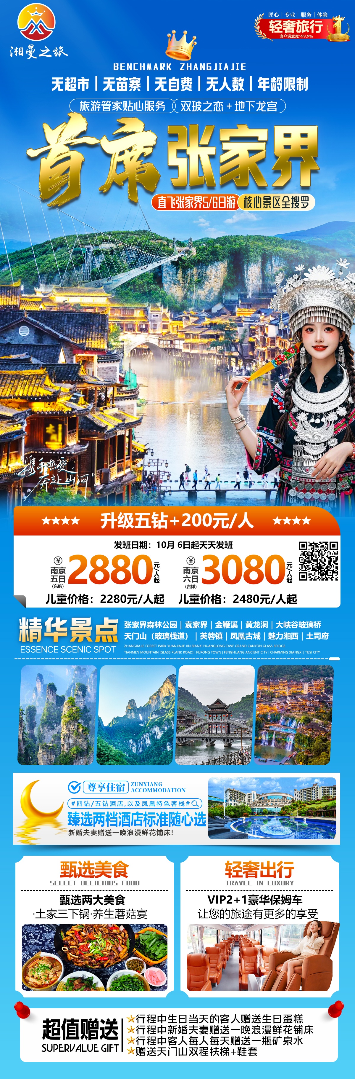 湖南省、 张家界市、 张家界袁家界、 张家界天门山国家森林公园、 张家界天门山玻璃栈道、 张家界大峡谷玻璃桥、 湘西王村芙蓉镇、 湘西凤凰古城