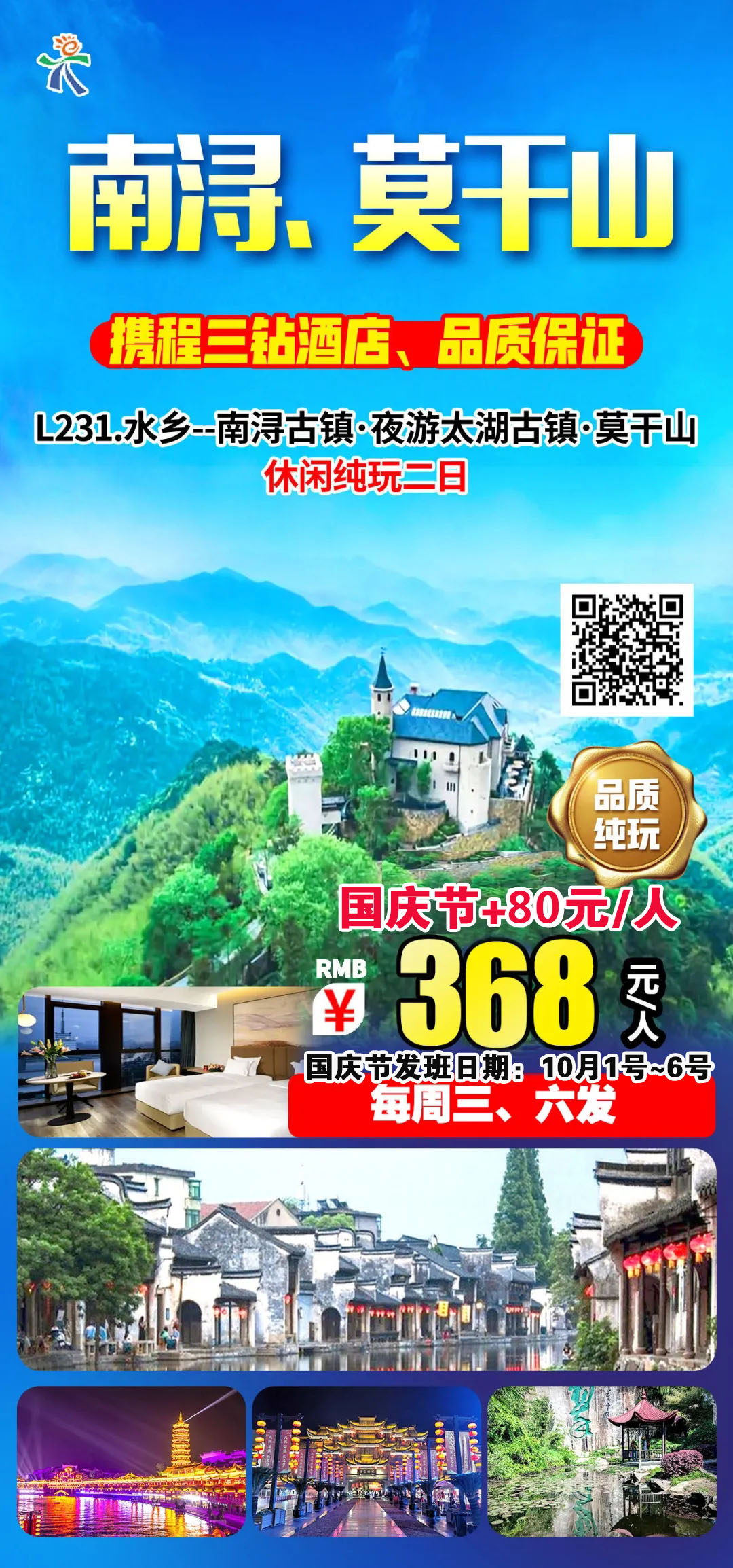 浙江南浔 莫干山2天1晚跟团游L231水乡---南浔古镇 夜游太湖古镇 莫干山休闲纯玩二日游]【大门票全含 宿携程三钻酒店】
