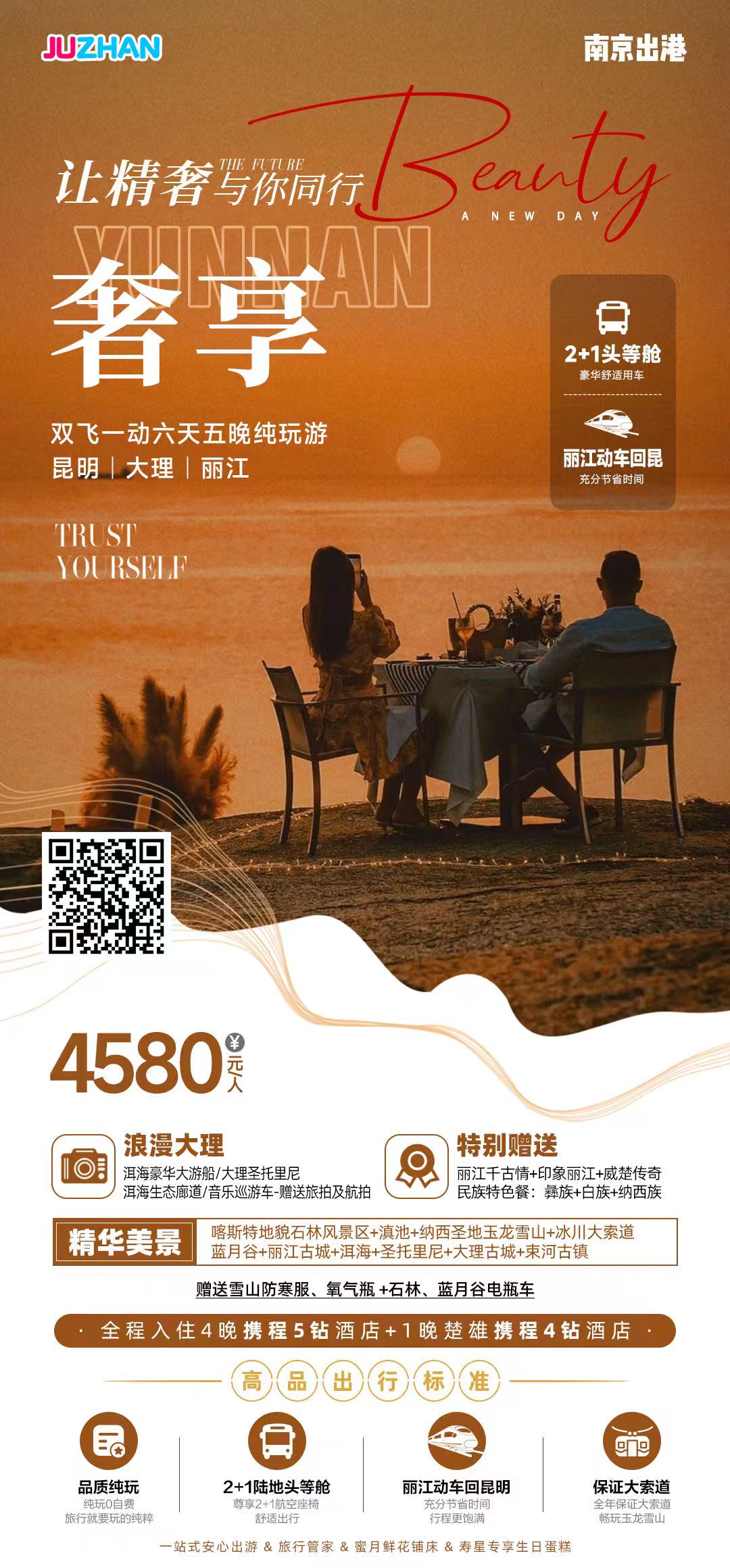 奢享昆明+大理+丽江5晚6日跟团游【丽江千古情】+【印象丽江】+2+1陆地头等舱+丽江动车返昆