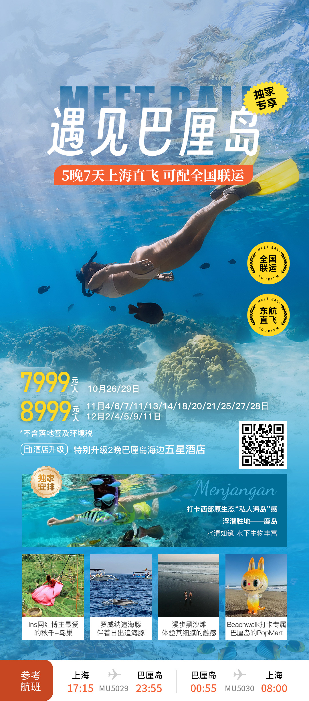 参考航班:巴厘岛-上海MU5030(00:55-08:00)具体航班以最终出票为准