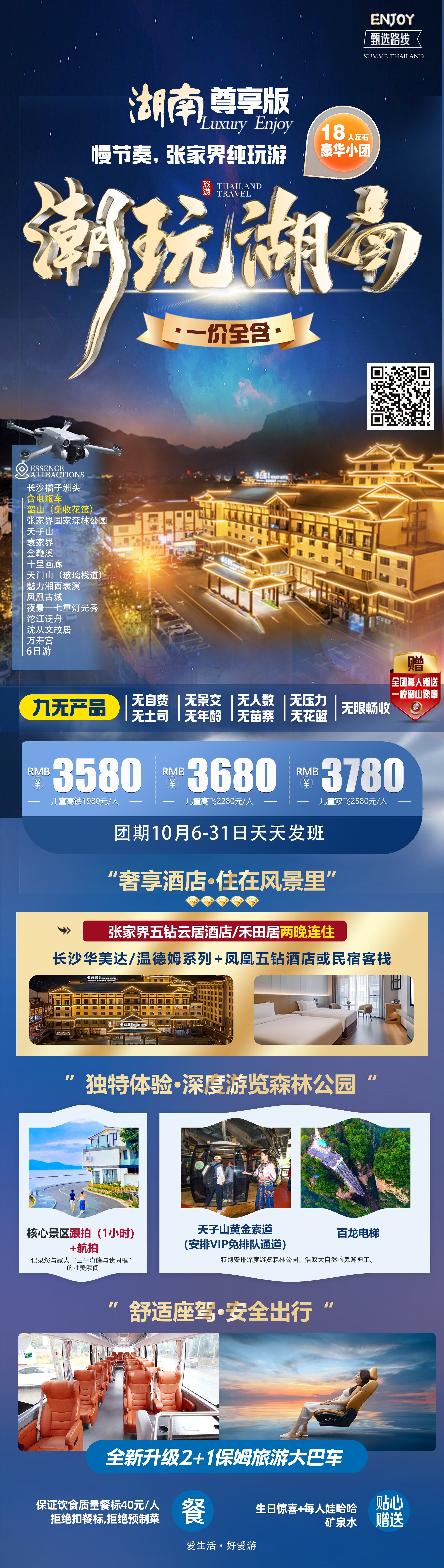 1、一价全含,9无产品,无超市、无土司、无自费、无苗寨、无景交、无年龄限制、无人数限制、无韶山献花篮,无限畅收。