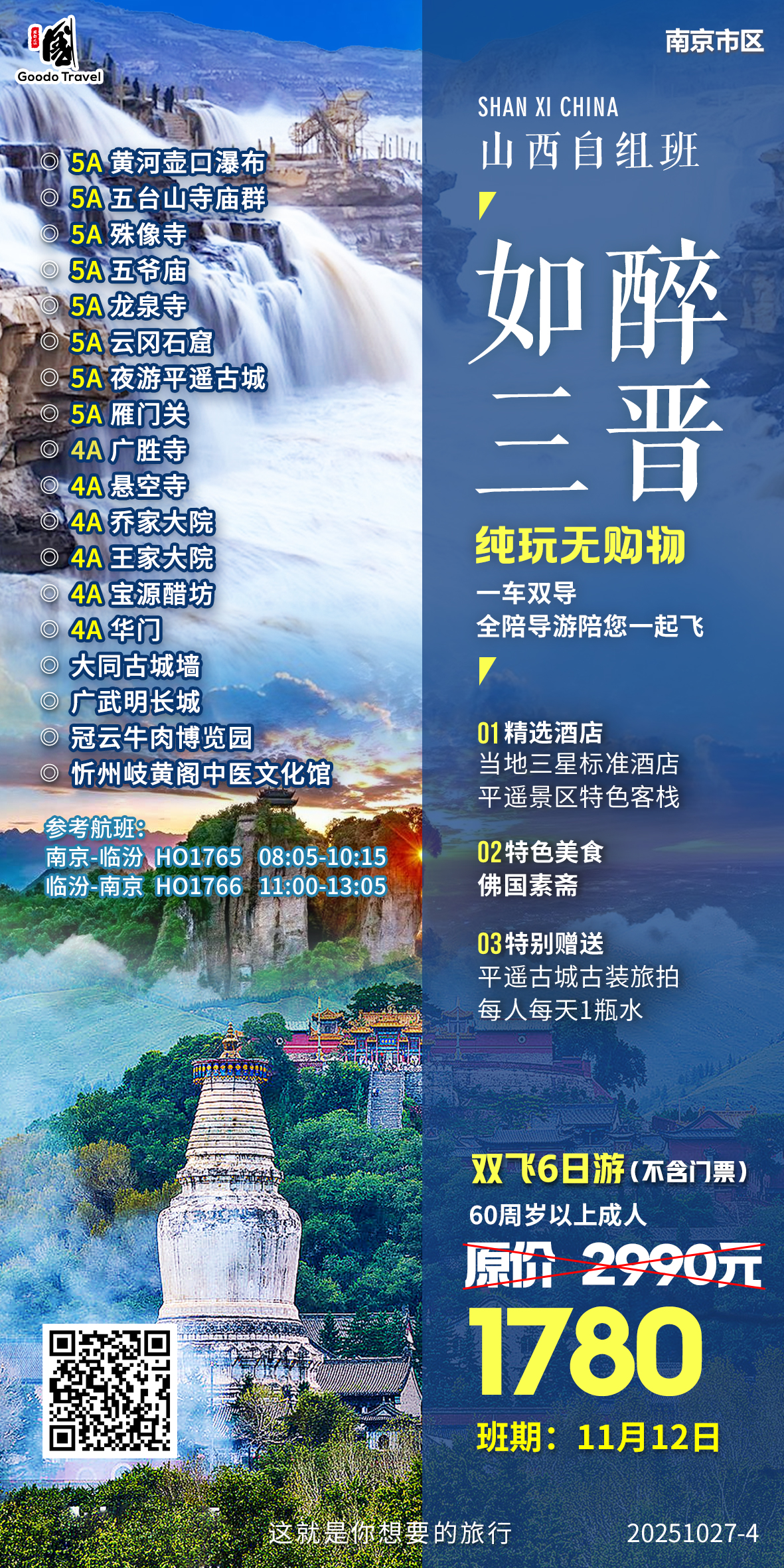 2025年11月如醉三晋(山西双飞6日)6天5晚跟团游自组班产品,出发地独立成团,区别于全国散拼团