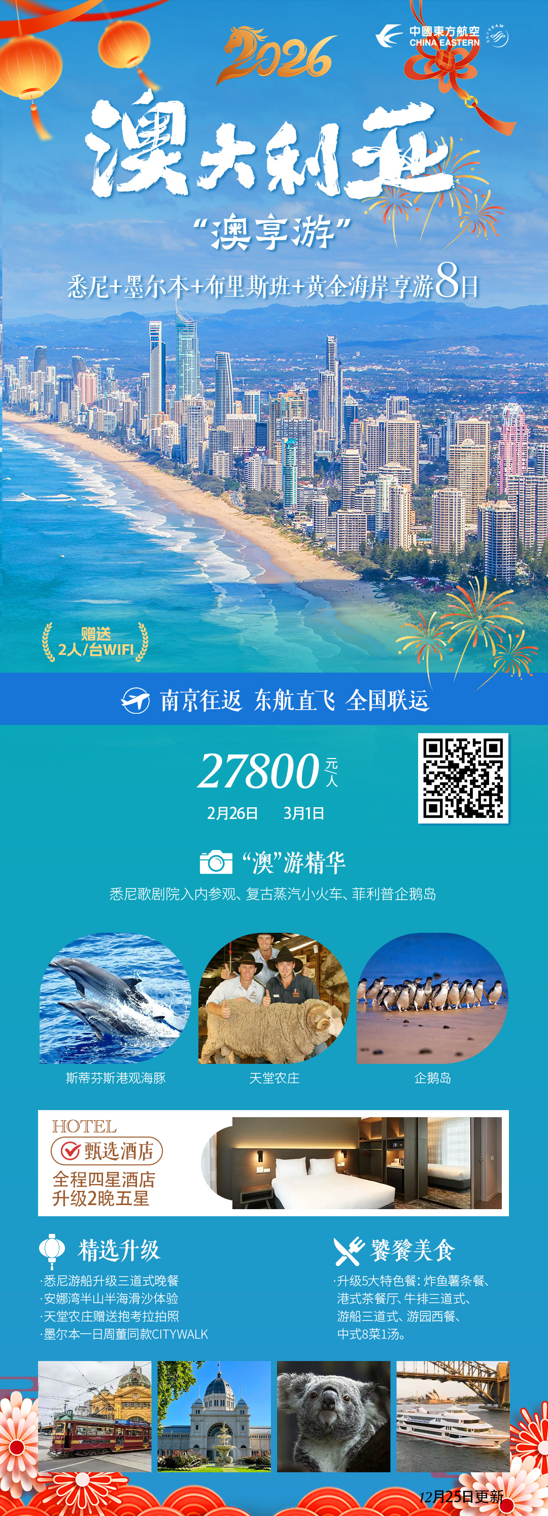 国旅自组春节班期【澳享游】澳大利亚四城8日(悉尼进墨尔本出)悉尼+布里斯班+黄金海岸+墨尔本