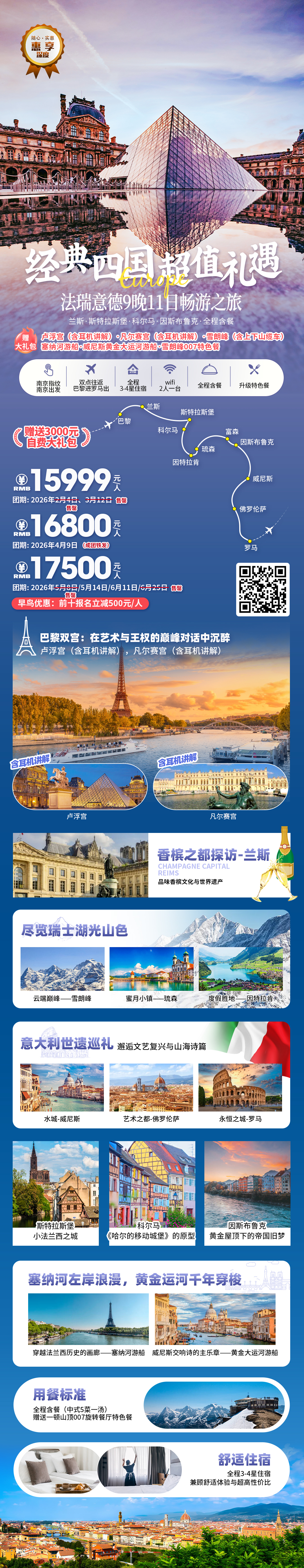 【惠享·深度】法国+瑞士+意大利+德国9晚11日跟团游兰斯·斯特拉斯堡·科尔马·因斯布鲁克·全程含餐· 赠送价值3000元自费大礼包:卢浮宫(含耳机讲解)·凡尔赛宫(含耳机讲解)·雪朗峰(含上下山缆车)·塞纳河游船·威尼斯黄金大运河游船·雪朗峰007特色餐·