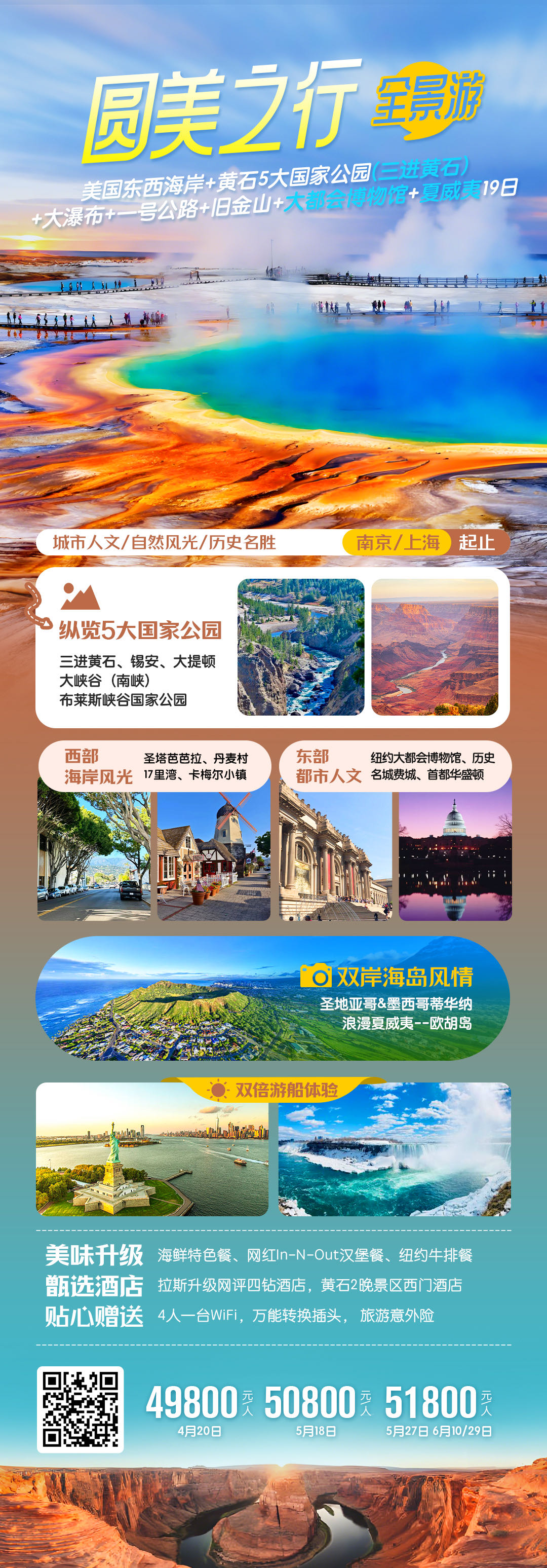 美国东西海岸+黄石5大国家公园+羚羊峡谷+马蹄湾+一号公路+旧金山+大瀑布+夏威夷19日游圆美之行.全景游