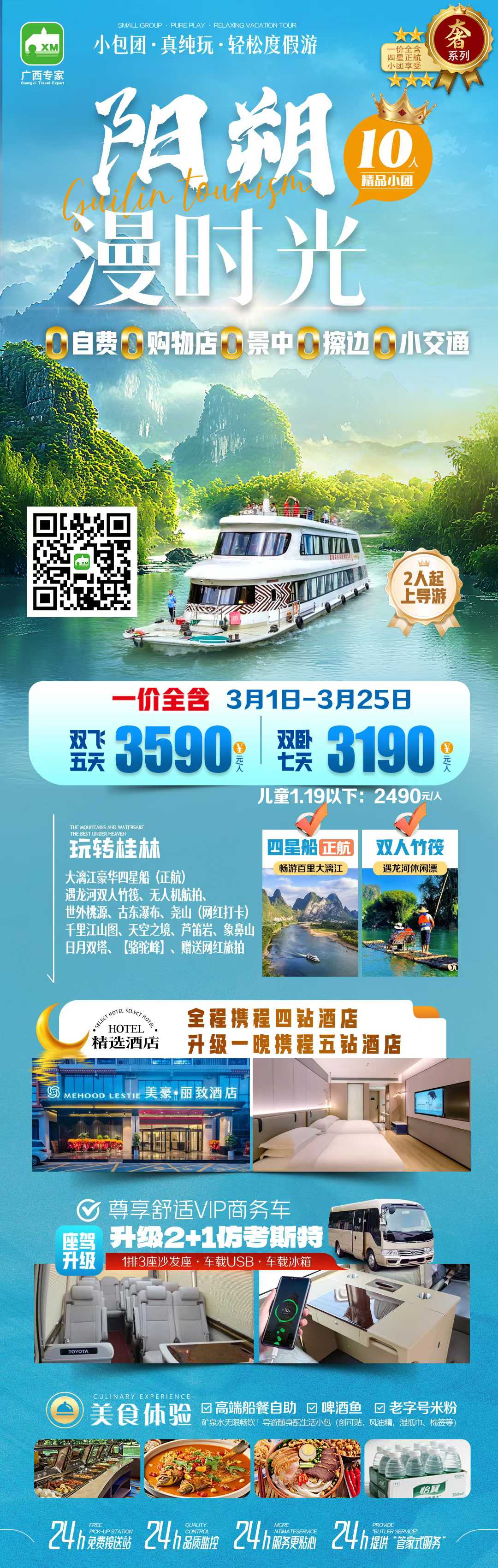 3、自由活动期间不提供导游服务与旅游用车、请注意安全并保管好贵重物品,谨记导游告知的注意事项、阳朔不含晚餐,自由畅享当地美食---“吃”、“玩”两不误;