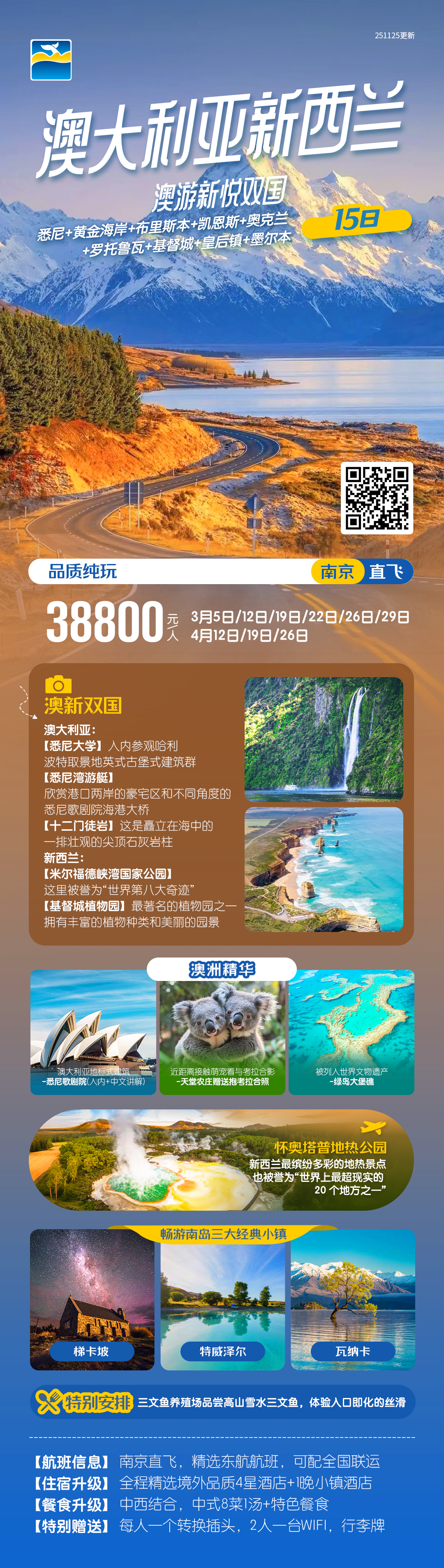 国旅自组【澳游新悦】澳大利亚新西兰双国15日(墨尔本进悉尼出)悉尼+凯恩斯+黄金海岸+布里斯班+奥克兰+罗托鲁瓦+基督城+特维泽尔+皇后镇+墨尔本15日