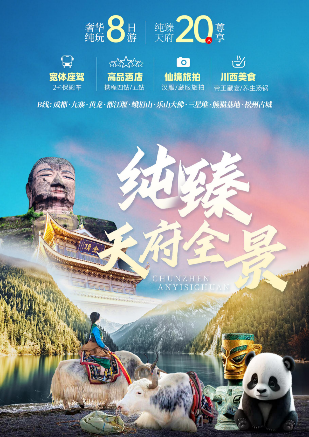 精选王炸组合:九寨沟,黄龙,峨眉山(金顶+半山),乐山大佛登山,大熊猫,都江堰,三星堆或东郊记忆