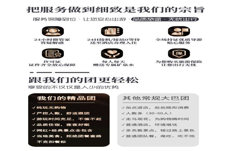2、此产品为纯玩无购物无车销产品,部分景区、餐厅等有商品出售,非旅行社安排,请游客自行选择,自愿消费。