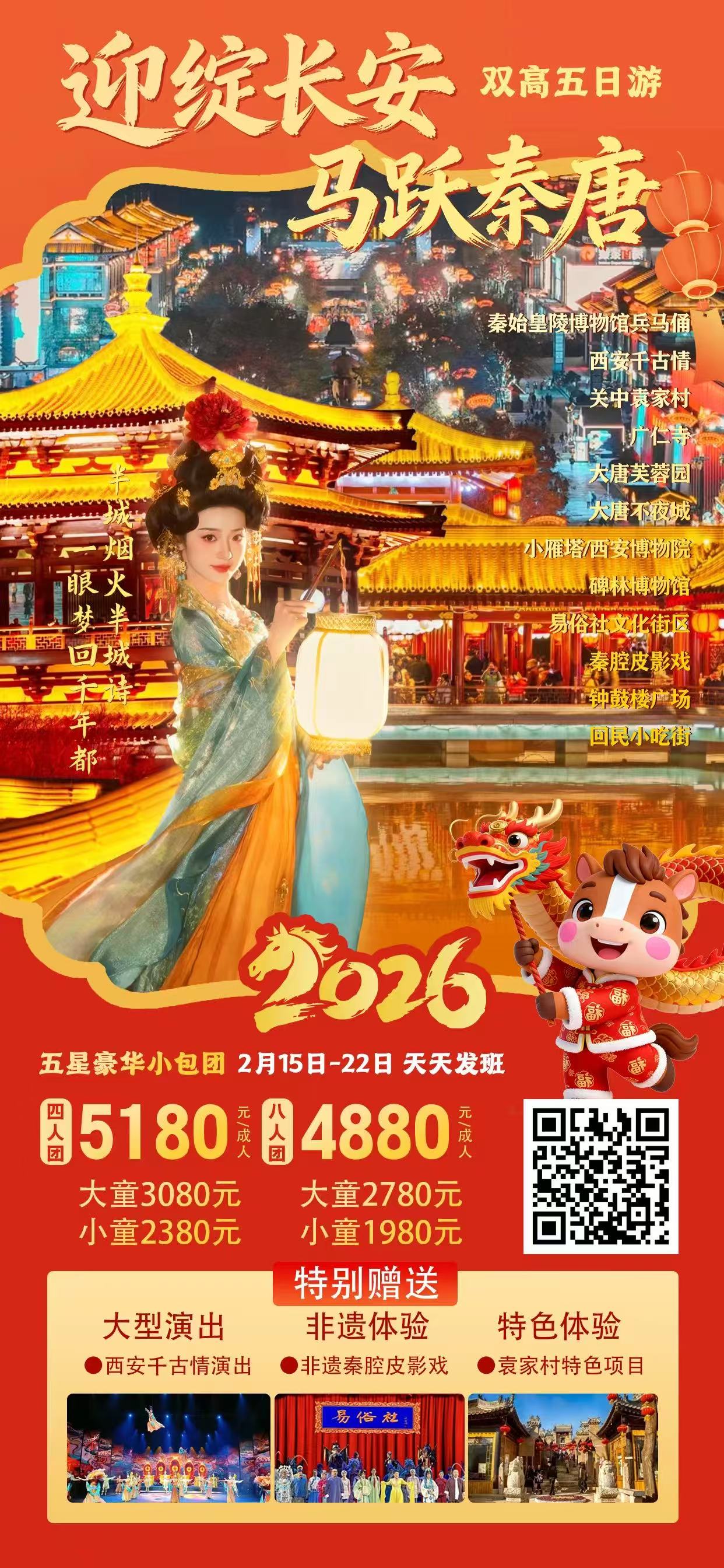 西安兵马俑+千古情+碑林博物馆+袁家村特色体验5天4晚定制团春节自营精品纯玩小团「西安博物院+广仁寺+秦腔皮影戏+碑林博物馆+大唐芙蓉园+关中袁家村+钟鼓楼广场」