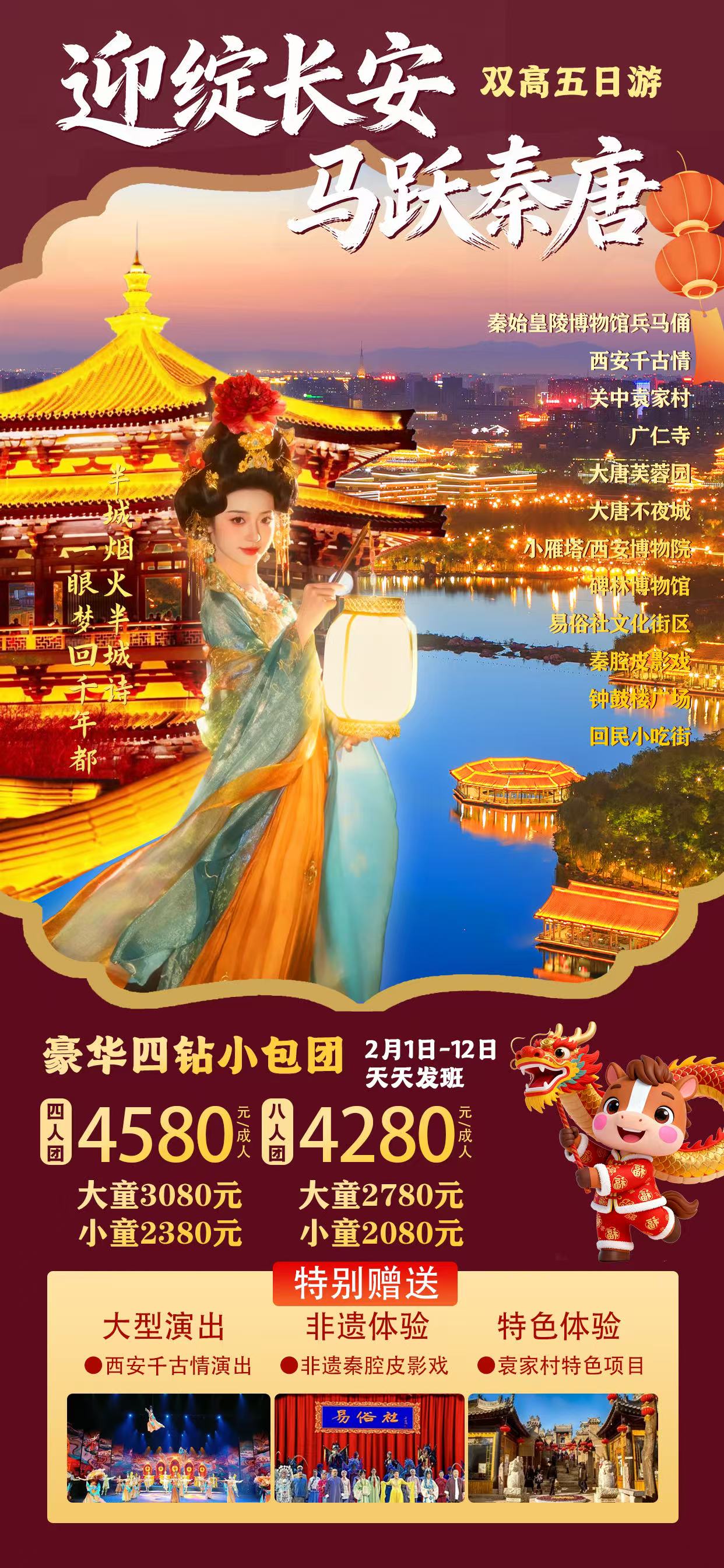 西安兵马俑+千古情+碑林博物馆+袁家村特色体验5天4晚定制团寒假亲子精品纯玩小团「西安博物院+广仁寺+秦腔皮影戏+碑林博物馆+大唐芙蓉园+关中袁家村+钟鼓楼广场」