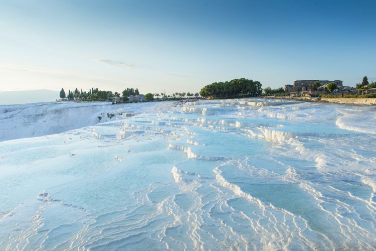午餐后,参观【棉花堡】,这里有世界上独一无二奇妙景观。由高达35ºC的富含矿物质的地下水从100米高的山上翻滚而下,经过长年累月,奶白色的钟乳石层层叠叠,聚结成棉花装的岩石,故称棉花堡,类似中国四川黄龙的彩池。喷涌而出的泉水还可用来治疗心脏病,高血压,神经衰弱,关节炎等疾病。