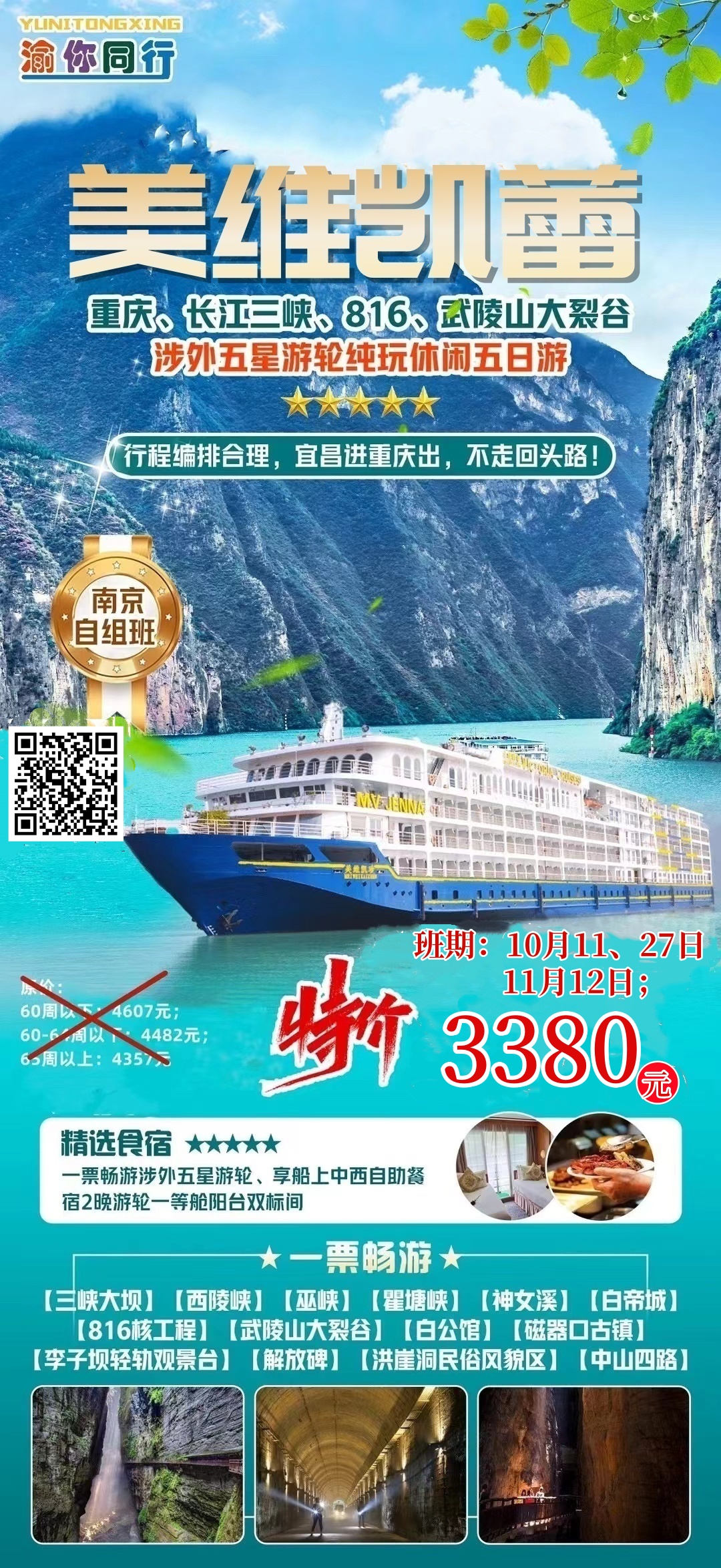 早晨游船抵达万州港,早餐后乘车赴涪陵游【816 地下核工程】(含门票50元,换乘车5元,电瓶车单程10元)(游览时间 1.5 小时),该工程先后投入 6万多建设大军,基础建设用时 8年,上世纪 80年代为止总投资 7.46亿元人民币。具有典型的山、散、洞的布局,也具有神奇、神秘、神圣这三大特点,在此次开放的唯一一个洞室——810大厅内可以看到,空间非常庞大,足以摆下一座足球场或者一栋 20层的楼房。而在大厅顶部,还有许多圆形的通气孔,在大厅四周的墙上还保存着钢制的走廊。所建造的为生产原子弹服务的重庆 816地下核工厂是"世界第一人工洞体"。午餐后游览有着”中国第一动感峡谷”美誉的【武陵山大裂谷】(精华环线)(游览时间约2小时,门票70元换乘车20元电瓶车10元上行索道45元),景区集山、峡、林、泉、瀑、崖、洞、潭、溪、坑、缝于一体,特别是其状如薄刀、连绵上千米的绝壁石峰国内罕见,一段长约1500米的裂谷地缝冠绝天下。在绿荫葱茏的主游道上,分布着一处处奇观异景:刀削斧劈,突兀而起,绝壁相对,情人谷、忘忧谷、六百梯、青天峡、开口石、镇天印等。一路行来,别有洞天,移步换景,数不胜数,目不暇接,美不胜收。适时乘车赴酒店。