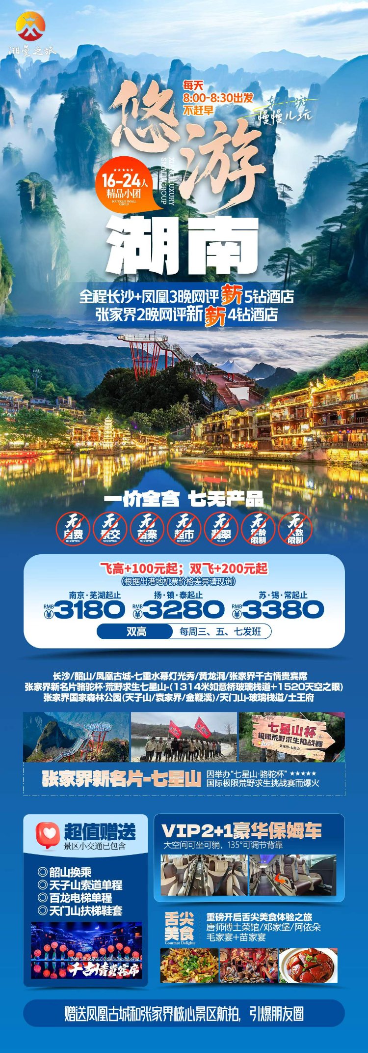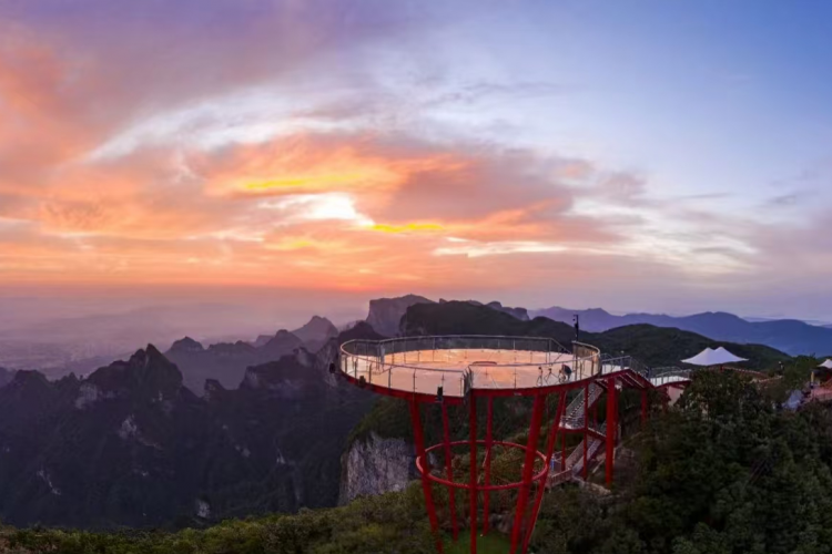 早上8点30出发前往张家界,游览【七星山国家森林公园】七星山是张家界旅游新名片,这里因举办“七星山·骆驼杯”国际极限荒野求生挑战赛而爆火,七星山属世界罕见的喀斯特孤峰台型地貌,四面多为约500~700米不规则的悬崖绝壁,与张家 界天门山隔峡谷并立,最高海拔1528.6米。七星山顶为形似哑铃状分布的巨型丘陵台地,平均海拔1400米,山顶台地面积约为32平方公里,上有较高山峰7座,呈北斗七星分布,因此得名七星山。【1314米如意桥玻璃栈道】海拔1314米,全长199.99米,宽1.9米,含30米挑空莲花观景台,寓意“一生一世”。栈道悬于绝壁,可俯瞰云海与喀斯特地貌,【1520天空之眼】海拔1520米玻璃观景台,寓意“一生一世,你是我的眼”,360°俯瞰张家界城区与群山。晚上观看《张家界千古情》贵宾席,浓缩了张家界亿万年的历史文化与传说。