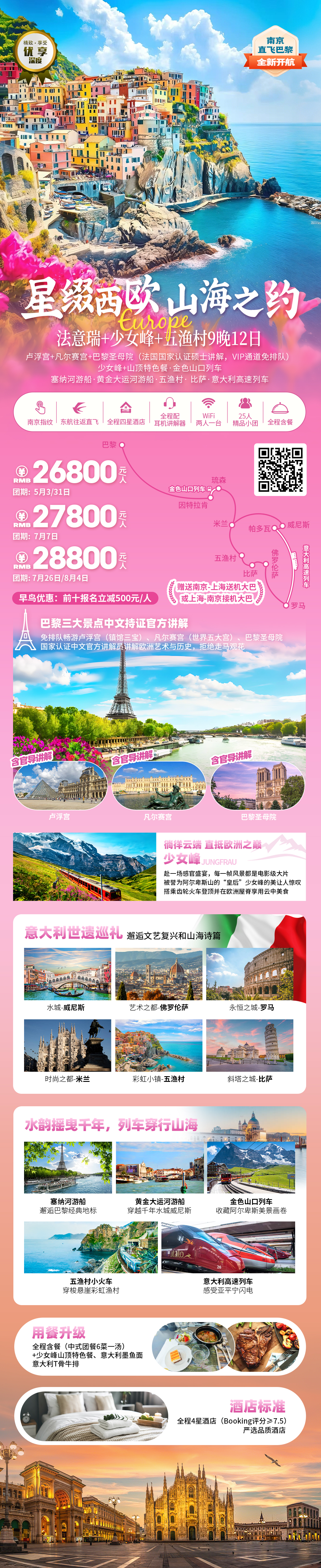 6.行程所列景点门票:卢浮宫(含官导讲解)、塞纳河游船、凡尔赛宫(含官导讲解)、巴黎圣母院(含官导讲解)、少女峰(含上下山缆车)、黄金大运河游船、金色山口列车二等座、五渔村小火车(游览1-2个渔村)、意大利高速列车二等座。