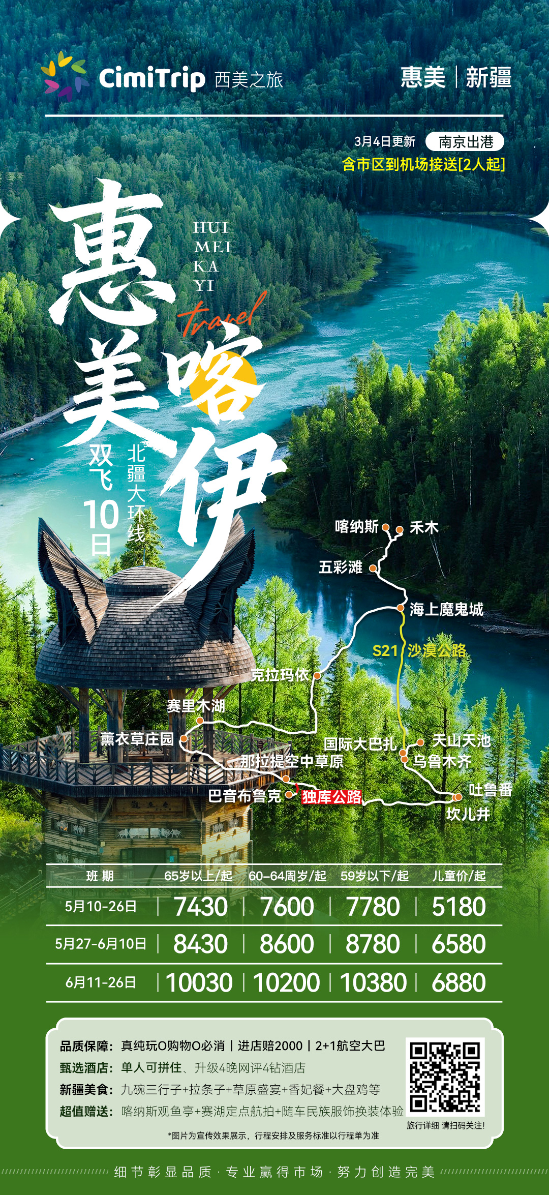 新疆北疆、伊犁环线9晚10日跟团游S21沙漠公路、海上魔鬼城、五彩滩、喀纳斯、禾木、赛里木湖、果子沟大桥(车观)、那拉提空中草原、独库公路中段、巴音布鲁克、吐鲁番、坎儿井、天山天池、国际大巴扎 双飞10日游