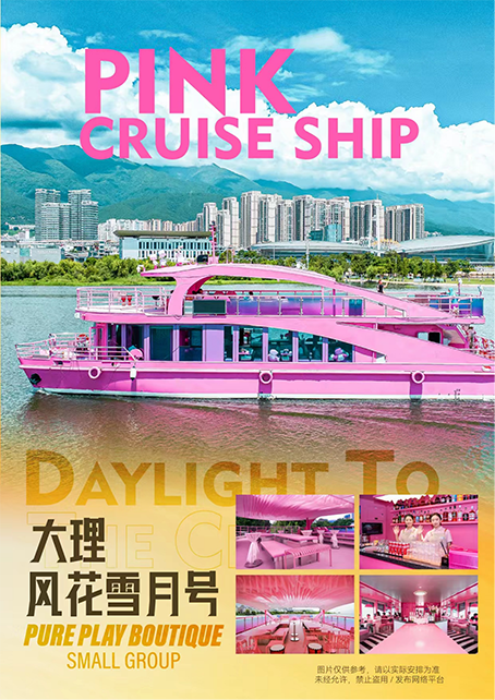 贵宾按照提前约定时间起床,早餐后乘车前往大理,游览【崇圣寺三塔】(含电瓶车)崇圣寺三塔是大理“文献名邦”的象征,是云南古代历史文化的象征,也是中国南方最古老最雄伟的建筑之一。背靠苍山,面临洱海,三塔由一大二小三座佛塔组成,呈鼎立之态,远远望去,雄浑壮丽,是苍洱胜景之一。中餐特别安排“白族私房菜”品当地特色美食。下午乘【洱海“风花雪月”号粉红游船】蜜桃粉的船身、白色的栏杆与洱海的碧波形成鲜明撞色,像闯入了一场浪漫的梦境。尾尖划开的涟漪里,映着游船的粉红倒影,风裹着洱海的湿润气息拂来,此时举起相机,无需滤镜,就能定格下 “粉红船 + 苍山洱海” 的标志性画面。今天将特别安排大理网红no.1【爱丽丝奇境花园跟拍】(园区内摄影师跟拍,以团为单位,每组家庭赠送不少于30s视频一个)一座绝美花园在山顶等你!在这座绝美的花园里,每一个角落都是一个绝佳的拍照点、斜坡花境、沙生植物区、无边泳池相连洱海、白水台、树屋/洞穴、浪漫鸢尾礼堂、誓言阶梯、海岛鸟巢,专属于你的拍照圣地。晚餐独家安排“摩洛哥洞穴海景落日晚餐”,在大理的神秘花园深处,有一个令人神往的洞穴,当落日的余晖如诗如画地洒在苍山洱海之间,一场令人陶醉的红酒落日晚宴即将开启,大理的美景、落日的温柔、红酒的香醇,共同编织成一段难忘的美好时光。晚上安排特意甄选的大理海景酒店,入住海景房,美梦与您相伴。