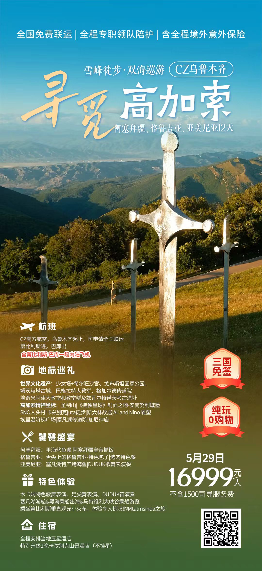 早餐后,开始今日的游览。 参观【三位一体大教堂】(入内参观游览约40分钟左右)。这座教堂并非一座很古老的教堂,建于1995年-2004年间,但却是格鲁吉亚有史以来建造的最大的东正教教堂,也是高加索地区最大的宗教建筑 午餐后,游览【第比利斯老城】,城市建立于公元5世纪,分为旧城、新城两部分,旧城滨水,新城傍山。自古以来,第比利斯就位于丝绸之路介乎欧亚的商道上,融合了各个民族的不同文化。参观【和平桥】、【木偶剧钟楼】、【老城街道】、第比利斯最大的【干桥跳蚤市场】(全程游览约1小时) 乘坐空中缆车到达城中心的高山上,可以在山上俯瞰整个城市的景观,后参观“格鲁吉亚母亲“塑像,外观游览约40分钟左右。之后前往游览纳瑞卡菈堡垒,要塞建筑已经严重损毁,但位置是俯瞰第比利斯全城的好去处(全程游览约1小时) 特别安排乘坐第比利斯垂直观光小火车,第比利斯缆车-乘坐新改建的缆车,体验令人惊叹的Mtatmsinda之旅,沿途不仅有便捷的交通方式,还有壮观的城市全景。 【格鲁吉亚编年史纪念碑】(外观游览 40 分钟)“格鲁吉亚编年史”——是一个纪念碑石柱,位于 Temka,Keeni山,纳扎拉德维地区。这座纪念碑建于 1970 年,其作者是著名的雕塑家祖拉布·特雷特利。 纪念碑描绘了各种历史和宗教事件的场景,以及格鲁吉亚文学作品中的故事。青 铜和石雕描绘了与主有关的伟大日子和基督生命的浮雕。 从此处可以俯瞰整个第比利斯海。 第比利斯地下印刷厂---充满神秘和历史意义的地下印刷博物馆位于第比利斯,揭开了1903年至1906年间革命活动的秘密篇章。在此期间,这个秘密地点成为孟什维克和布尔什维克的繁忙中心,他们在整个俄罗斯帝国及其他地区印刷和传播非法报纸、书籍和宣言,使用格鲁吉亚语、俄语和亚美尼亚语。 晚餐后送往机场搭乘航班前往阿塞拜疆首都-巴库。 首选航班:(如格鲁吉亚-阿塞拜疆陆地口岸开放,则我司将调整行程方案,由飞机口岸改陆地口岸入境,机票费用成本平移增加游览城市舍基的成本,不退旅游费用,且此方案不属于旅行社违约) 航班3:J29234 第比利斯-巴库 2010-2120 航班4:J29226 第比利斯-巴库 2355 0105+1 航班5:J28234 第比利斯-巴库1750 1900 备选航班 航班1:J29230 第比利斯-巴库 0825-0935 航班2:J29224 第比利斯-巴库 1150-1300 由于境外内陆段航班需要实名信息预定,若遇到首选航班满位则改定临近可预订航班; 如内陆段航班实际为早航班,则调整第比利斯住一晚,次日飞巴库(不减少景点)达后办理入境手续,导游接机,入住酒店休息。巴库是阿塞拜疆共和国的首都,是一座有着悠久历史的古城,城内有众多名胜古迹,15世纪的希尔凡王宫及17世纪的汗王宫殿至今保存完好。 | |||
