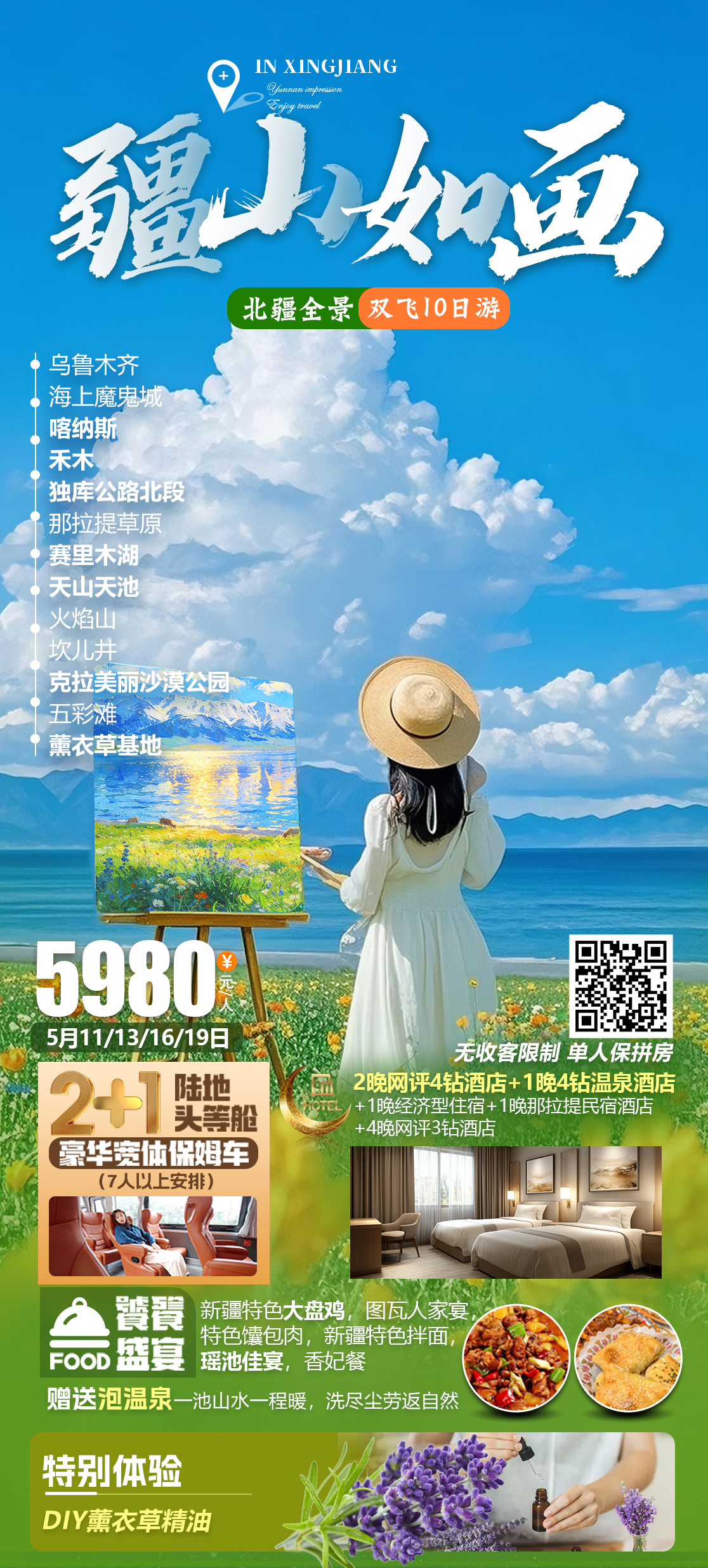 海上魔鬼城、喀纳斯景区、禾木景区、独库公路北段、那拉提草原、赛里木湖景区、天山天池、火焰山、坎儿井、克拉美丽沙漠公园、五彩滩、薰衣草基地