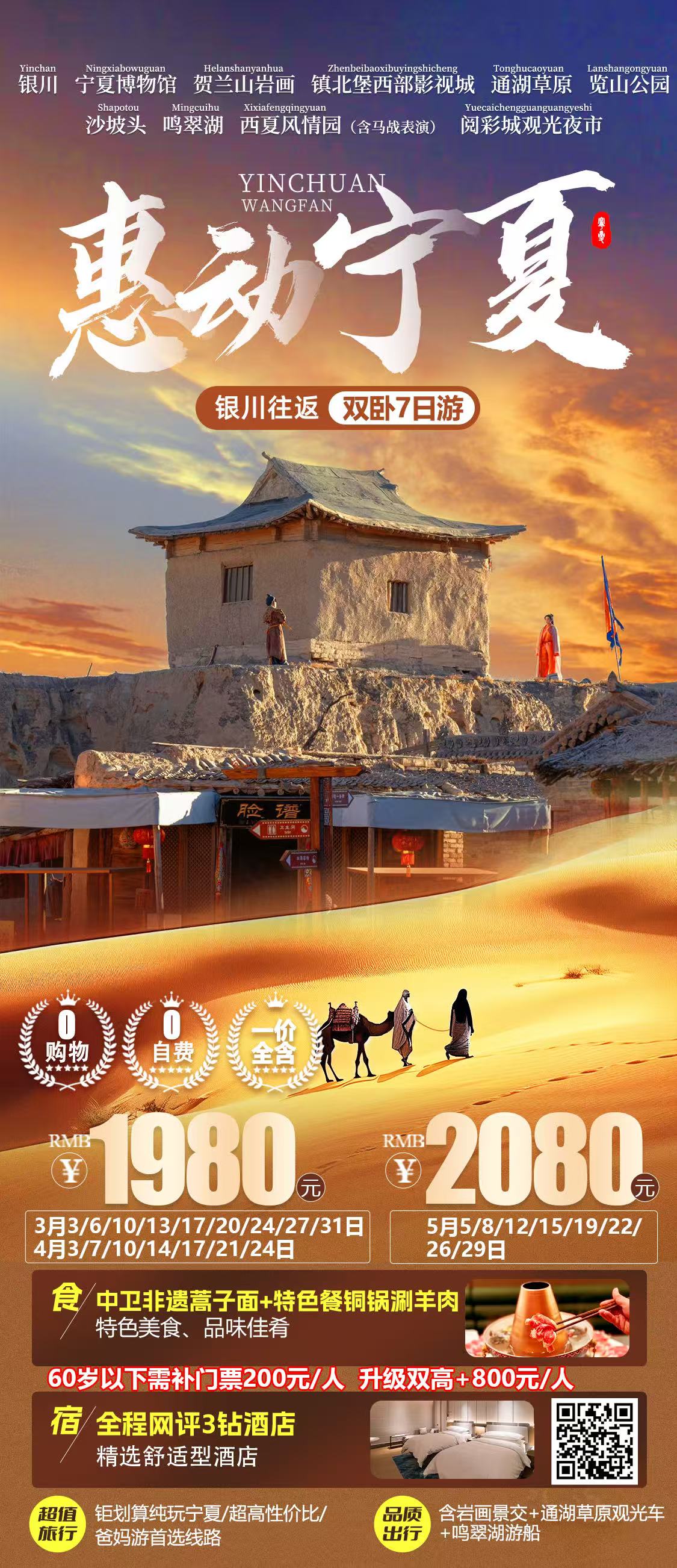 银川+贺兰山岩画+镇北堡西部影城+沙坡头+鸣翠湖+西夏风情园双卧7日游 跟团游 每周二、五发班惠动宁夏