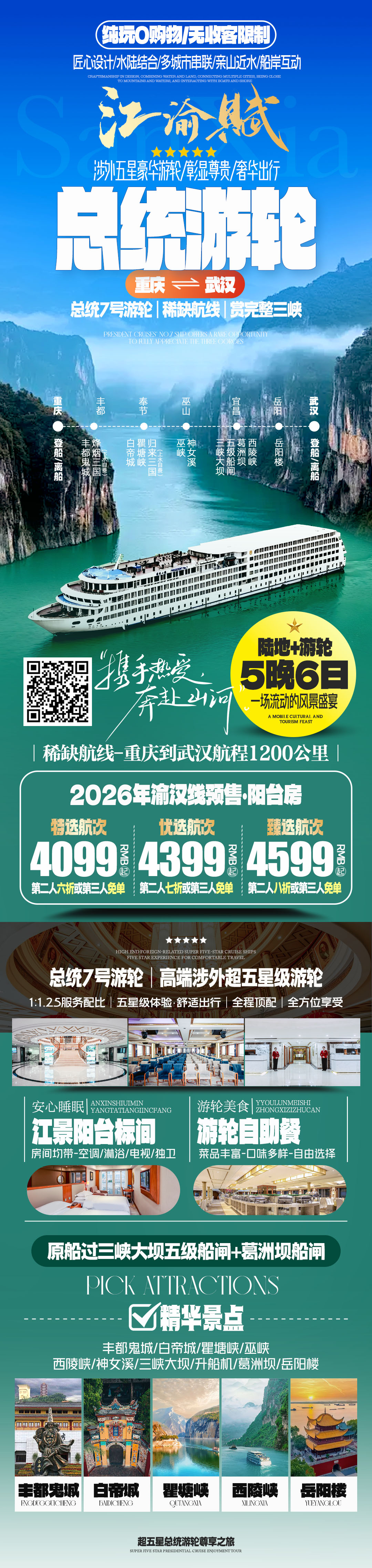 三峡邮轮6日 总统号(上水) 跟团游 4.15 4.25 5.15 5.25武汉-重庆