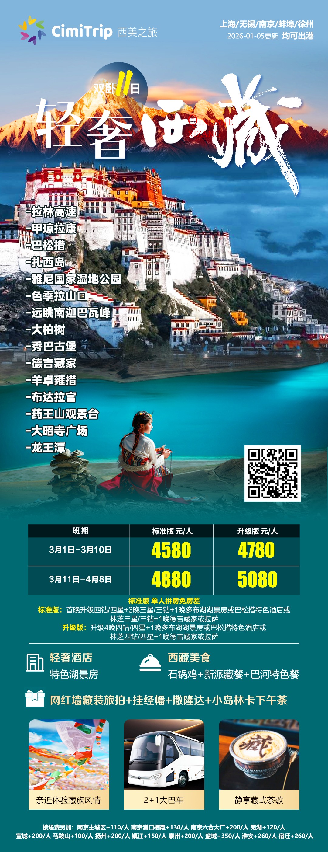 重要提示:导游会于到达当天 21:30 前电话或短信通知第二天的集合时间(如导游未联系请及时联系报名方,避免漏接)。