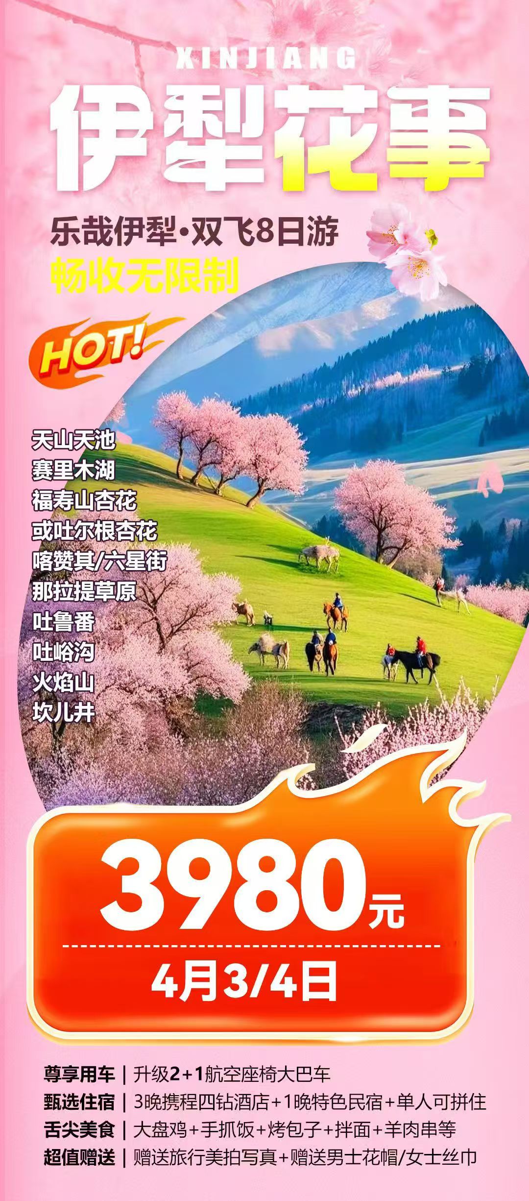 8天串联北疆春季精华,既能邂逅伊犁杏花季限定花海,饱览赛里木湖、天山天池的湖光山色,又能沉浸式体验那拉提草原游牧风情与吐鲁番坎儿井、火焰山的人文奇观。全程2+1商务头等舱大巴加持,行程松紧有度,自然与人文完美融合,是解锁新疆春夏之美的高性价比优选。