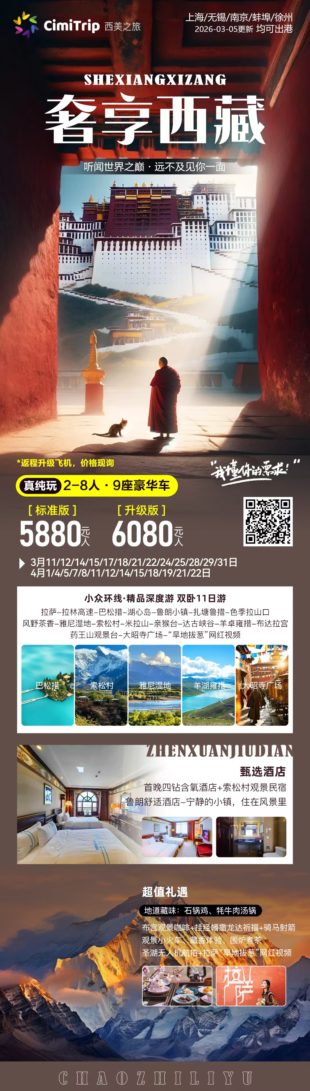 从藏文化发祥地泽当出发,奔赴被誉为“高原液态绿松石”的羊卓雍措,沿着湖岸线沉浸式半程环游,用无人机定格云端视角的湖光秘境。暮色时分,向着日光之城拉萨启程,在光影变幻中,串联起自然奇观与人文圣境的绝美画卷。