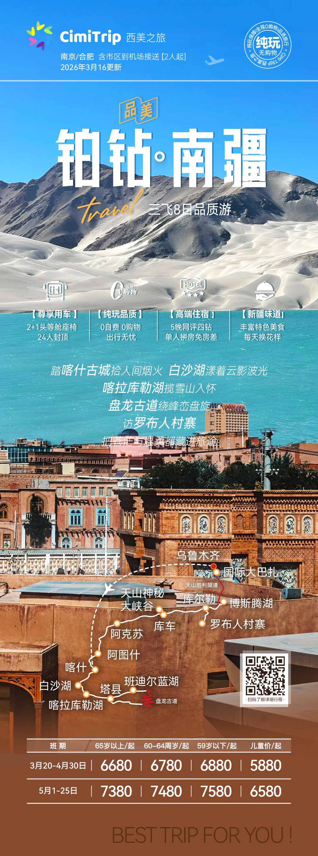 行程设计—1.疆内安排乌鲁木齐飞往喀什,省去1500公里路程,省时省力,让您的旅途更加轻松