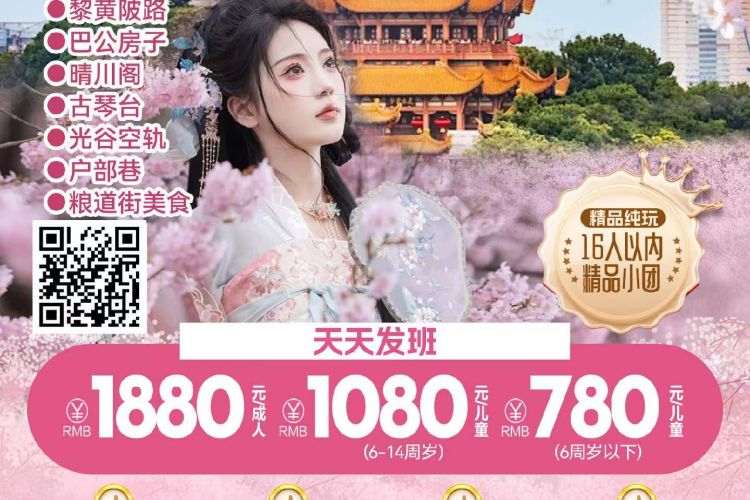 后乘车前往【晴川阁】(游览时间约1小时),素有“楚国晴川第一楼”的美名,雄奇古朴的晴川阁在层层叠叠的樱花错落有致的映衬下,少了咄咄逼人的锐气,添了几分秀丽婉约的气质。晴川阁的樱花是武汉春日里一道独特的风景线,它们与古老的建筑和壮阔的江景相互映衬,构成了如诗如画的美景。40余年树龄的樱花树,树干粗壮,巨大的树冠如粉白色的伞盖,微风拂过,落樱缤纷,故有“晴川吹雪”的美誉 。粉色的花瓣与晴川阁飞檐斗拱的古建筑相互映衬,古色古香的楼阁在樱花的环绕下,更显庄重典雅。阁前广场上,樱花与红色的楼阁形成强烈的视觉冲击。登上晴川阁,凭栏远眺,还能将长江的壮阔之景与岸边如粉色丝带般的樱花尽收眼底。(若晴川阁闭馆换成起义门,起义门高7.1米,宽5米,城门上嵌有长方形石匾一块,上刻叶剑英元帅题写的“起义门”三个金色大字。整个城楼高11.3米,为穿斗歇山顶式的双层建筑,飞檐凌空,檐下环以朱红廊柱30根。城楼两侧是高大厚实的带箭垛的灰色城墙。 起义门是武昌原有10座城门中唯一保留下来的旧建筑,是辛亥革命的见证、被历史学家称为“首义胜利的开端”,具有较高的历史价值和艺术价值。)