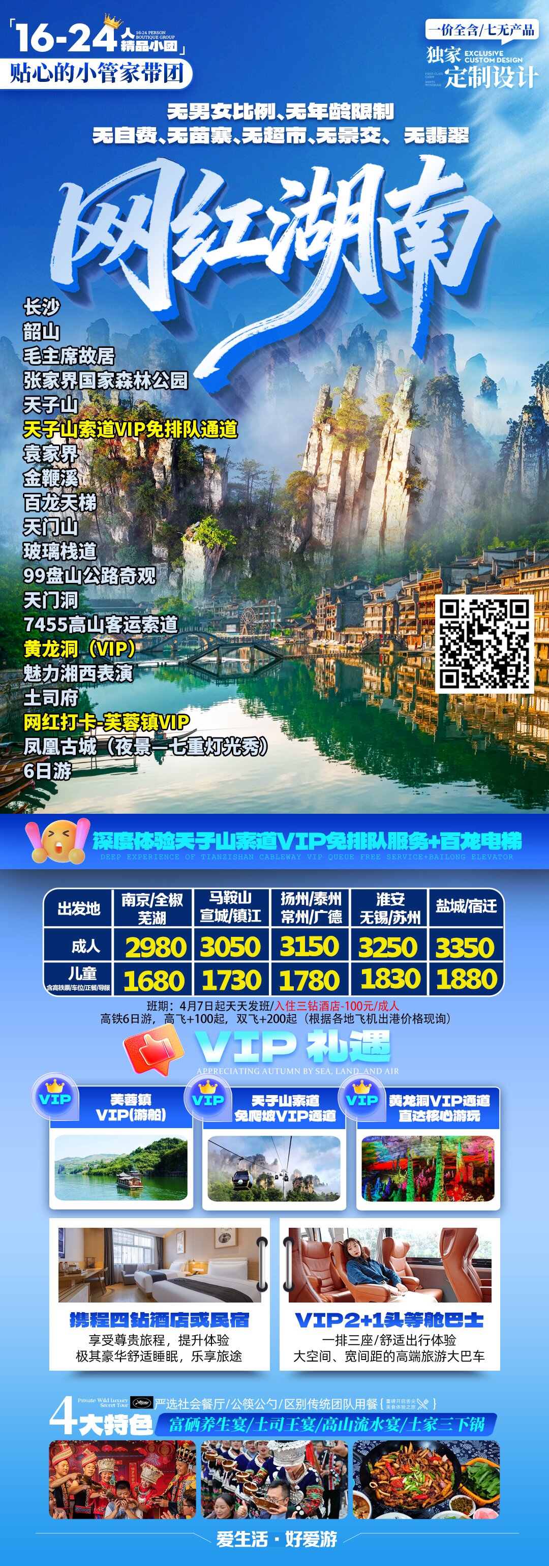 长沙、韶山、边城-茶峒拉拉渡(一脚踏三省)、张家界国家森林公园(天子山(天子山索道VIP免爬坡免排队)、袁家界(百龙电梯)、金鞭溪)、芙蓉镇(夜宿芙蓉镇+花开芙蓉)、矮寨大桥、天门山(玻璃栈道)、土司王府、魅力湘西表演、凤凰古城(夜景—七重灯光秀)