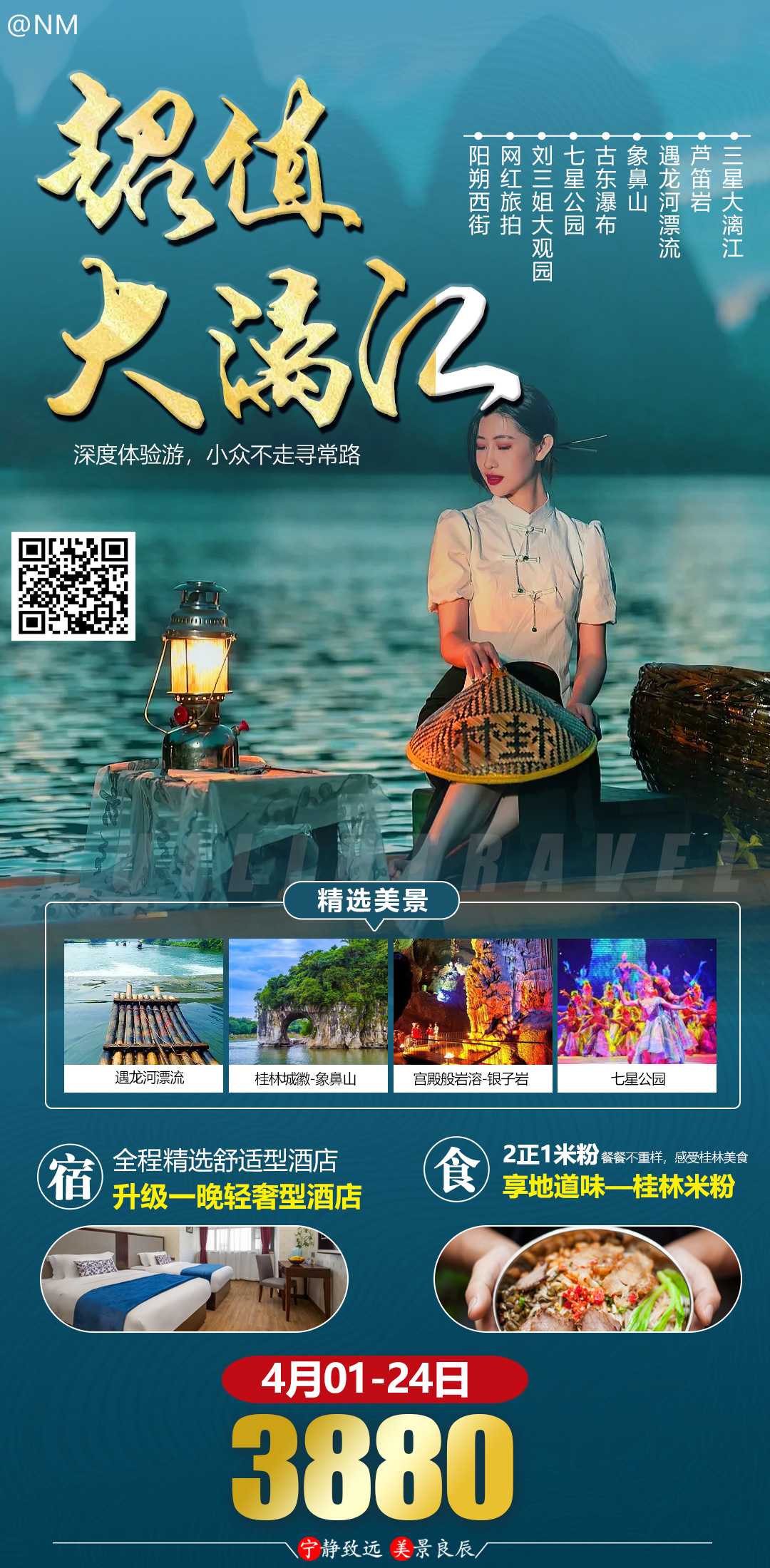 乘坐四星船游览漓江(码头电瓶车自理:单程15元/人,往返25元/人),一场奇妙的山水之旅就此开启(全程约 4小时)漓江是中华美丽山河的一颗璀璨明珠,素有“江作青罗带,山如碧玉簪”之美誉;2013年,美国CNN就把它评为全球精美15条河流之一。随着游船前行,可以欣赏到大漓江——兴坪佳境、黄布倒影、九马画山、浪石烟雨、杨堤飞瀑等五大美景,一幅如诗如画的山水长卷在眼前徐徐展开。先是杨堤烟雨的朦胧之美,远处山峦在云雾中若隐若现,仿佛披上了一层薄纱,如梦似幻;接着是浪石仙境,两岸奇峰罗列,怪石嶙峋,碧绿的江水倒映着青山,山水相依,宛如世外桃源。