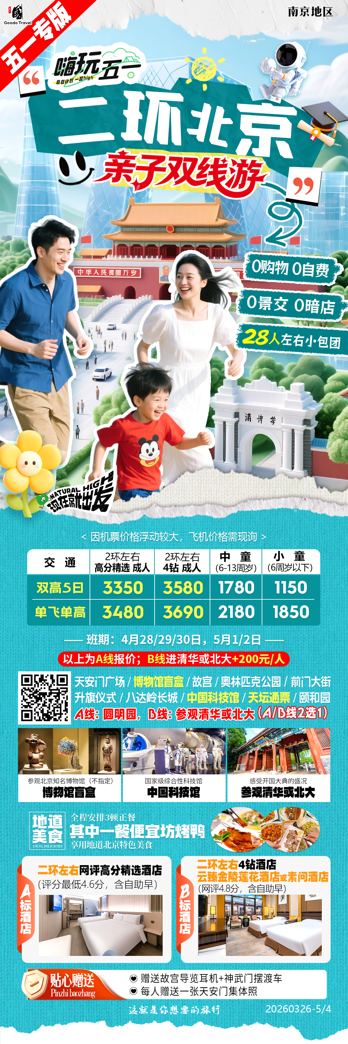 2026年五一节二环北京亲子双线游5天4晚跟团游——2钻0购物0暗店0自费0景区小交通,一价全含!!!
